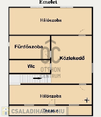 Emelet helyiségei: 2 hálószoba, fürdőszoba, wc,terasz.
