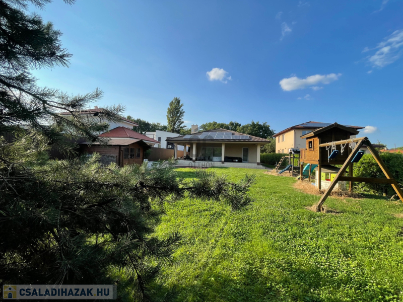 Csendes, kertvárosi környezetben, 1346 m²-es, teljes közműves telken eladó egy 2017-ben épült, egyedi tervezésű, kiváló állapotú családi ház, kiemelkedően alacsony fenntartási költségekkel és magas műszaki tartalommal.