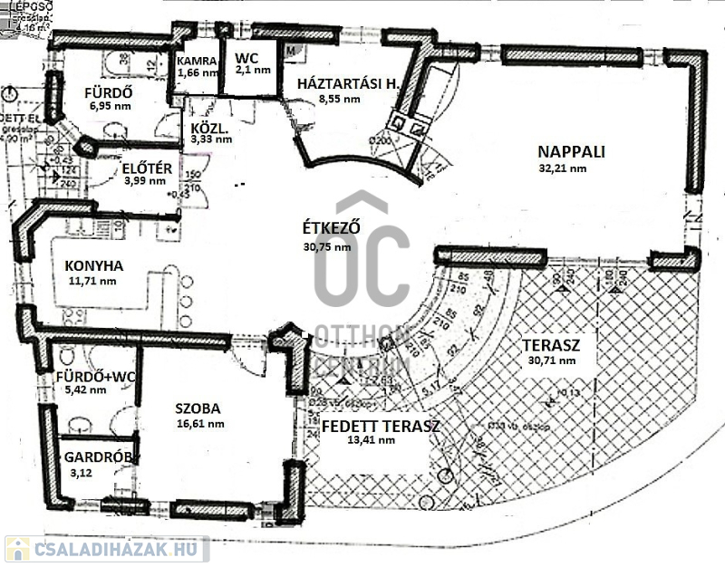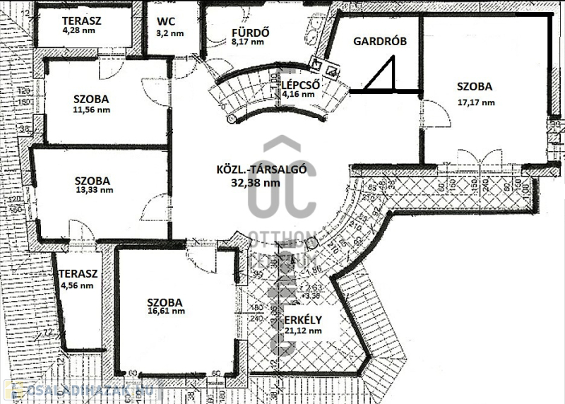 A földszinten egylégterű nappali--étkező--amerikai konyha (75 nm), egy gardrób és fürdőszoba kapcsolatos hálószoba, egy másik fürdőszoba, valamint WC, kamra, háztartási helyiség-kazánház található. Az emeletere vivő félköríves faburkolatú lépcső egy 32 nm-es társalgóba vezet. Innen nyílik 4 szoba --mindegyik erkély kapcsolattal--, fürdőszoba, WC, gardrób.