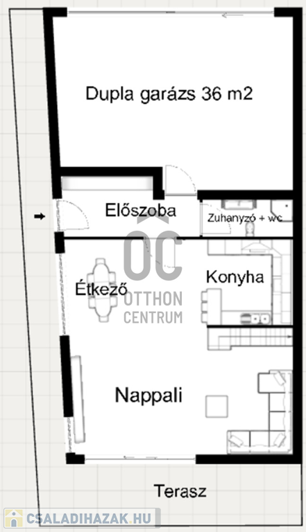 Földszint : kb 60 m2 - es konyha - étkező - nappali , zuhanyzós fürdő wc - vel, előszoba, félig fedett terasz.