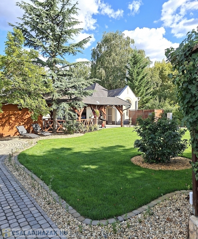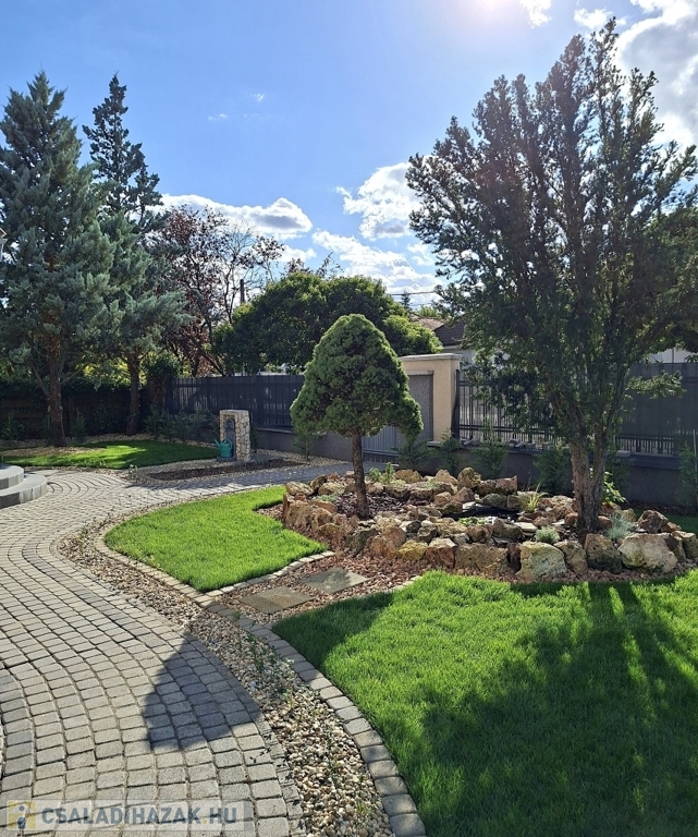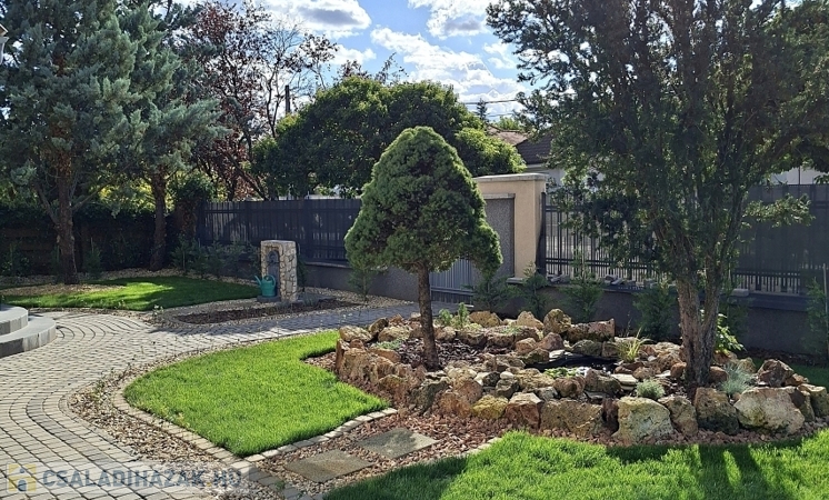 Az udvar öntözőrendszerrel felszerelt, így a sok örökzöld, virág, fű minimális karbantartást igényel. 10-15 növényeket, fákat megvilágító kerti lámpák az esti kerti sétákhoz. Sziklakert és vízköpő egyik és másik végén az udvarnak, hogy garantált legyen a kerti öröm. A kinti grillezőn, sütni kedvelőknek fedett főző rész füstkivezető üsttel. A dupla garázsban (50nm) wc, praktikus monolit födém jó belmagasság padlástér plusz tárolási lehetőség.