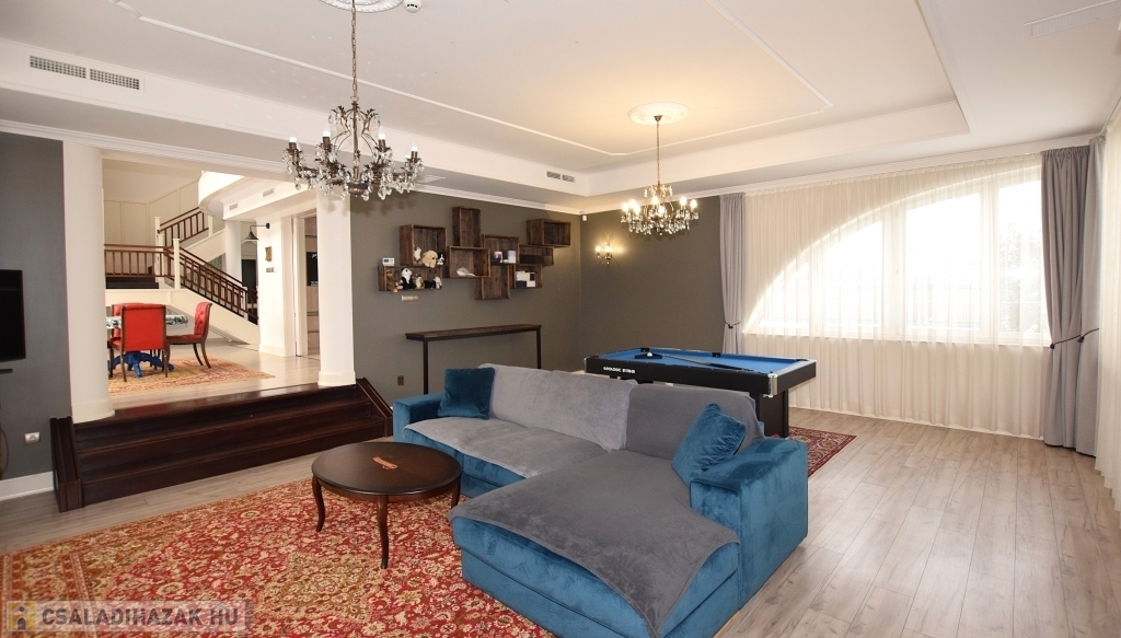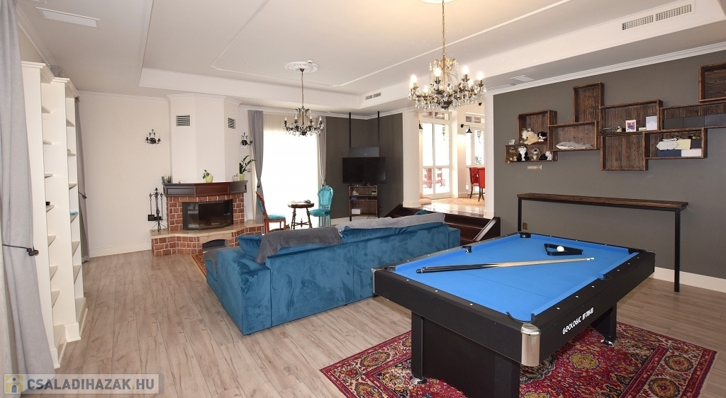 Földszinten található egy tágas nappali kandallóval, biliárdasztallal. Hatalmas étkező-konyha, mely elszeparálható igény szerint. A nappalin kívül van egy szintén tágas szivarszoba, mely használható társalgónak, irodának egyaránt vagy éppen egy külön lakrésznek is.