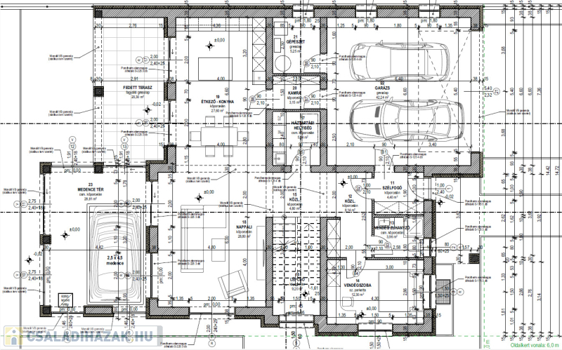 Helyiségei : 42 m2 - es garázs, amerikai konyha - étkező - nappali ( 56,4 m2 ), vendégszoba + zuhanyzó, fedett terasz, kamra, gépészeti helyiség + medence tér ( 28,81 m2 )