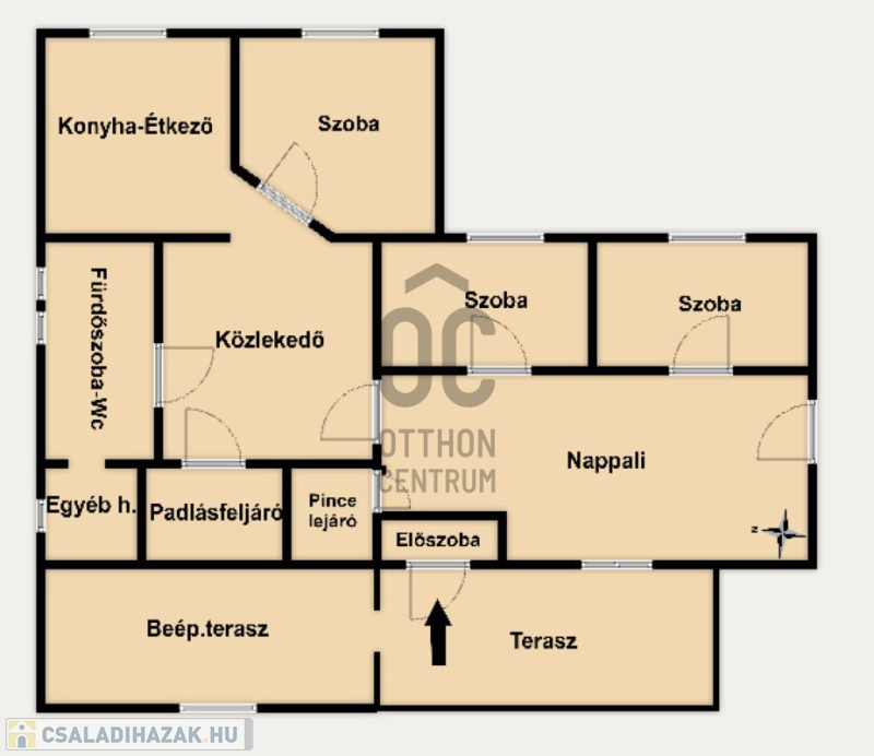 - helyiségei: nappali, 3 szoba, konyha, fürdőszoba-wc, 20 m2-es beépített terasz vizesblokkal