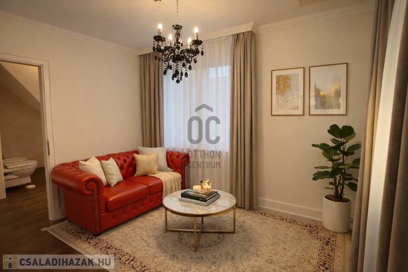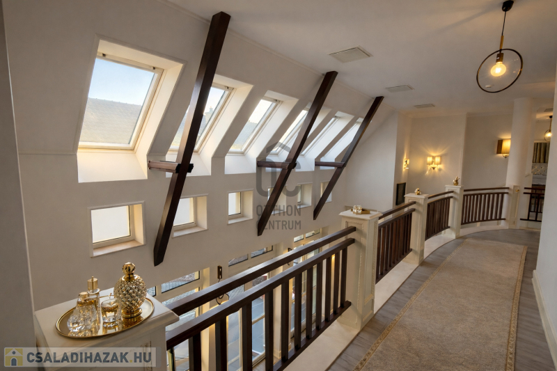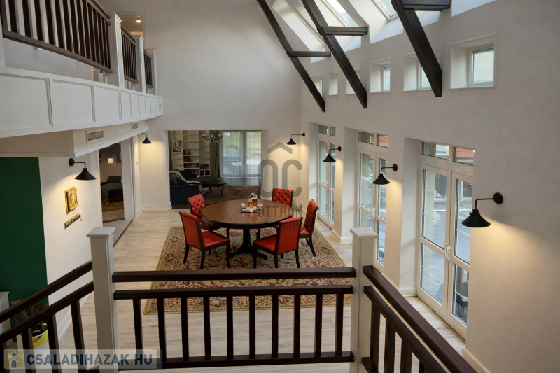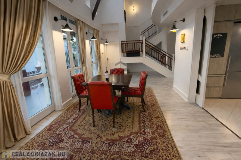 Az ingatlan egyik legkülönlegesebb eleme a lenyűgöző, 5,8 méteres belmagasságú étkező-nappali tér, amely villa hangulatot teremt.