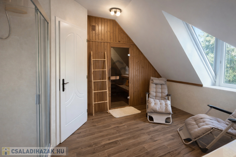 Az emeleti fürdőben egy 6 személyes finn szauna került kialakításra pihenőágyakkal.