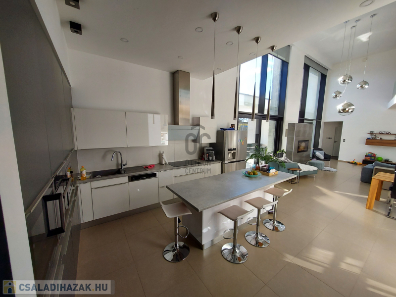 A ház három szinten terül el, hogy maximális kényelmet biztosítson a családja részére. A földszinten található tágas nappali, ÓRIÁSI mennyezetig érő, német Gealan, három rétegű üvegablakokkal rendelkezik, melyek gyönyörű kilátást nyújtanak a hatalmas teraszra és a gondozott, parkosított 1370 m2-es kertre, melyben egy ellenáramoltatóval felszerelt, fűthető, fedett medence lett telepítve.