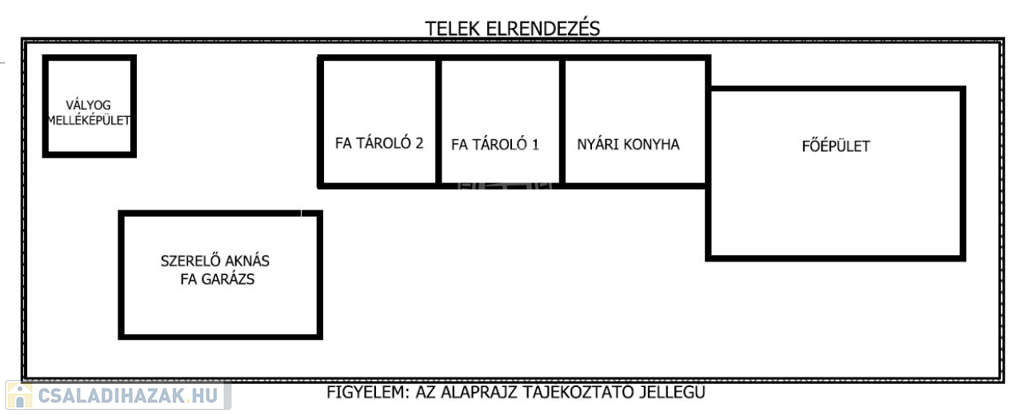 A házzal egybeépítve egy 18nm-es nyári konyha van. Az udvaron egy külön álló 16 nm fából készített fedett szerelő aknás garázs található. A telken van még egy fából készített lomos/tároló illetve a telek végén egy kis vályog épület.