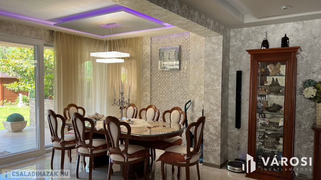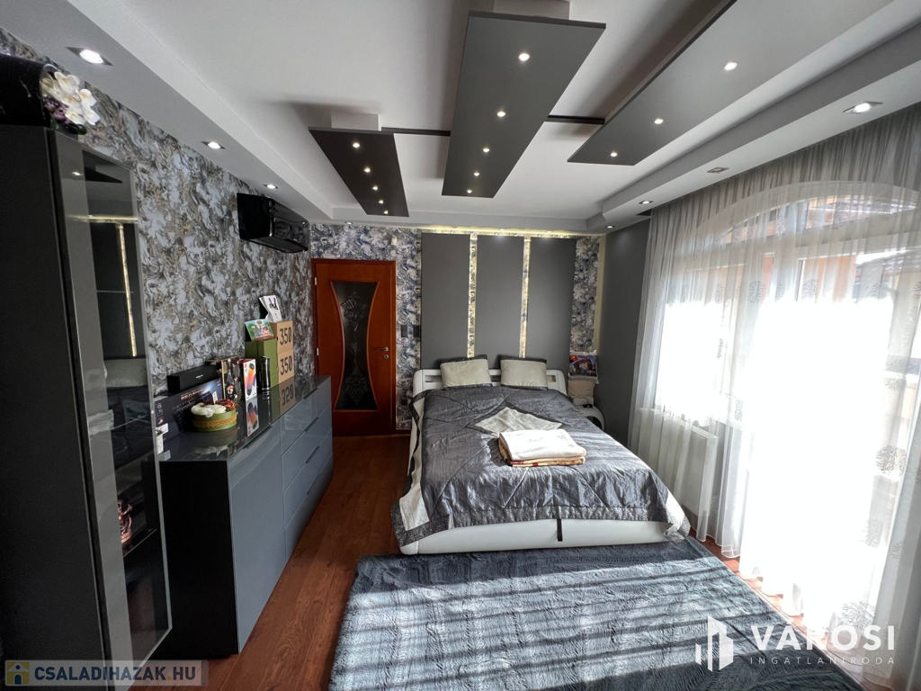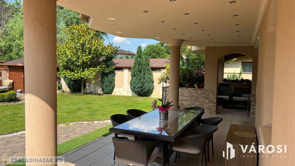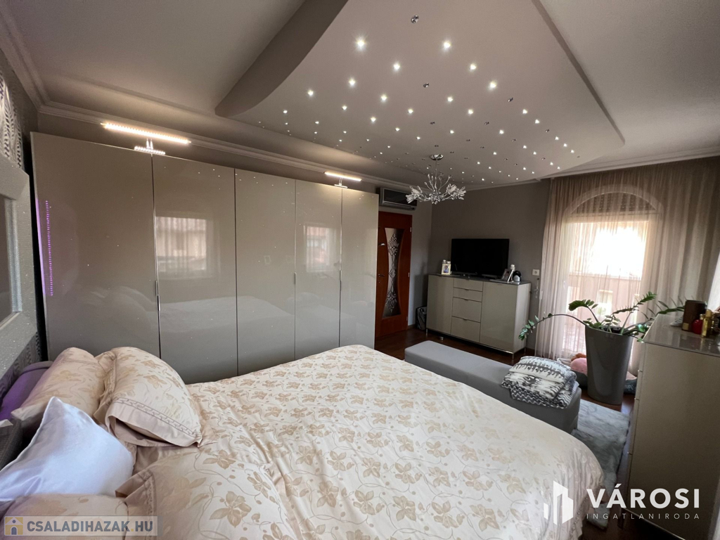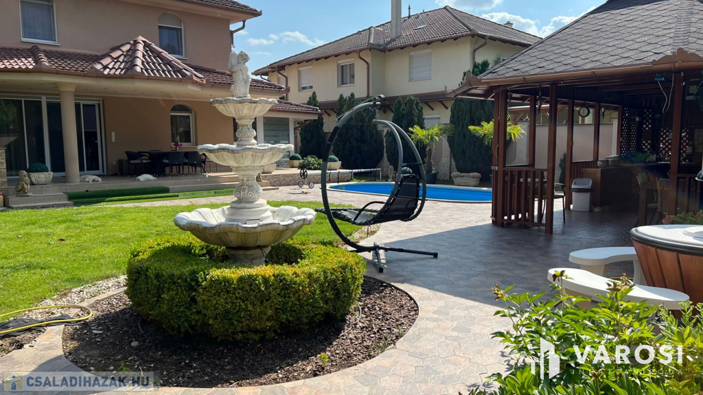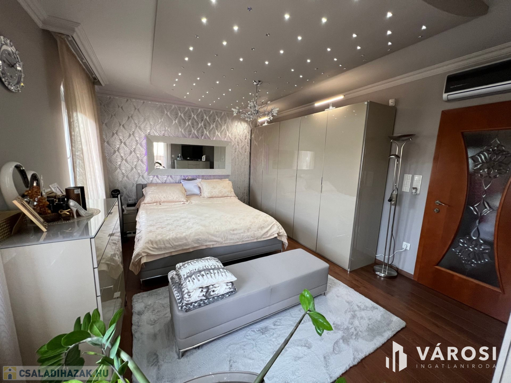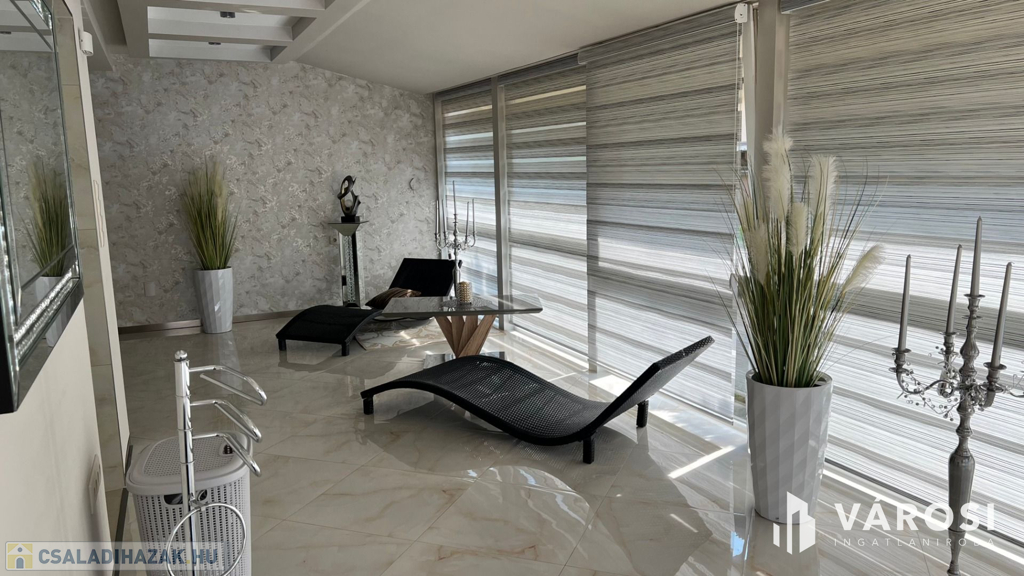 Debrecen kiemelt városrészén a Liget lakóparkban 332 nm-es önálló luxus ingatlan eladó. A ház alsó szintjén helyezkedik el a nappali, étkező, konyha, egy wellness rész zuhanyzóval, egy szoba, előszoba-hall, és egy wc. Természetesen a földszinti részen található még egy nagyméretű dupla garázs és egy terasz is. A felső szintre érkezve, egy nagy tér fogad bennünket, ahonnan eljuthatunk a három hálószobába, és a két nagyméretű fürdőszobába. A fenti szinthez tartozik még egy gardrobe szoba, egy mosókonyha, és minden szobához egy szép nagy terasz. A telek nagyméretű 760 nm-es + még egy hasonló méretű telekrész hátul, hozzá van kerítve. A kert szépen parkosított, és egy gyönyörű mindennel felszerelt filagória is helyet kapott benne. A filagória előtt egy fűtött medence is biztosítja a lakók kellemes luxusotthon érzését. Az ház magas műszaki tartalommal bír, és minden kényelmi extrával felszerelt, teljesen gépesített és bútorozott. És nem utolsó sorban Debrecen legelitebb városrészén található, igényes szép ingatlanok környezetében.