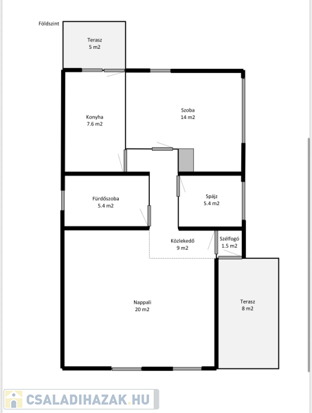 A földszinten nappali (20m2), hálószoba (14m2) (cserépkályhával), konyha (5m2) és fürdőszoba(7m2) ,illetve a lépcső alatti részben egy tároló került kialakításra. A beépített tetőtérben további két hálószoba (br. 15m2,20m2) és egy külön WC szolgálja a kényelmet.