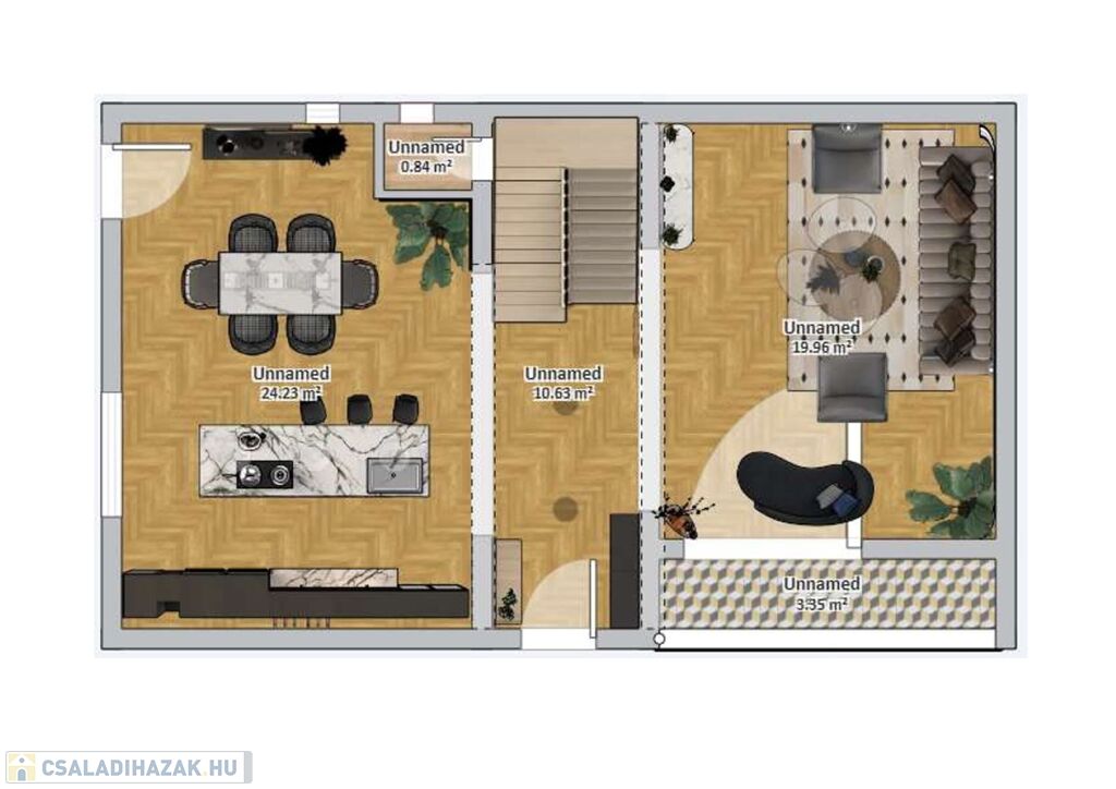 A földszinten konyha + étkező, lépcsőház valamint egy szoba, Wc és külön zuhanyzós fürdőszoba található. Felújítás során a teljes magasföldszint, tágas közös térré alakítható (inspirációként néhány tervet tartalmaz a képanyag).