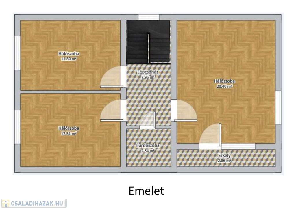 3 jó méretű hálószobája + fürdőszoba az emeleten kapott helyett. Szobáiban kifogástalan állapotú eredeti fa parketta található.