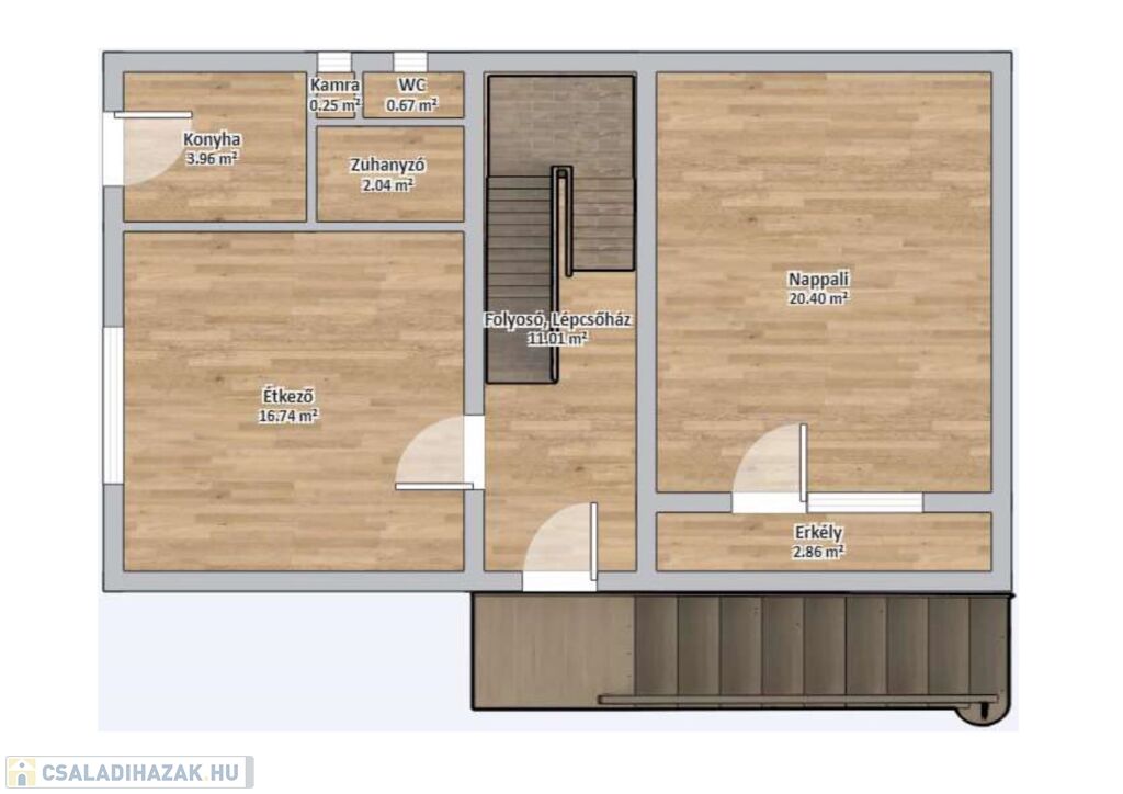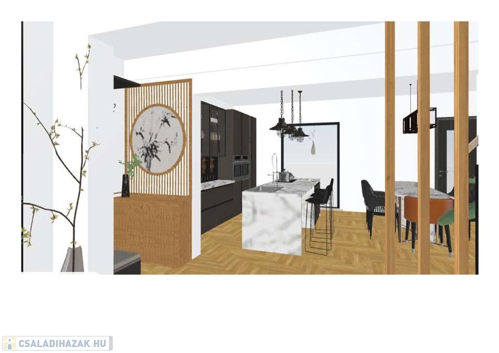 A földszinten konyha + étkező, lépcsőház valamint egy szoba, Wc és külön zuhanyzós fürdőszoba található. Felújítás során a teljes magasföldszint, tágas közös térré alakítható (inspirációként néhány tervet tartalmaz a képanyag).
