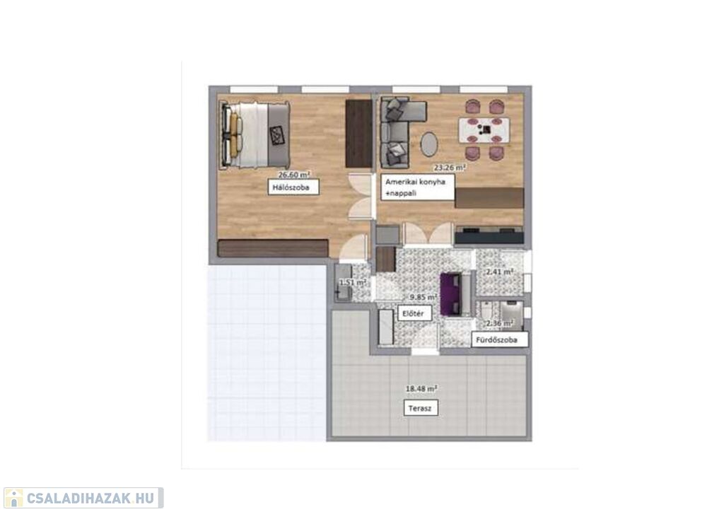 - nappali + étkező + konyha egy légtérben