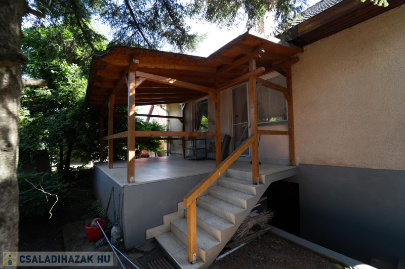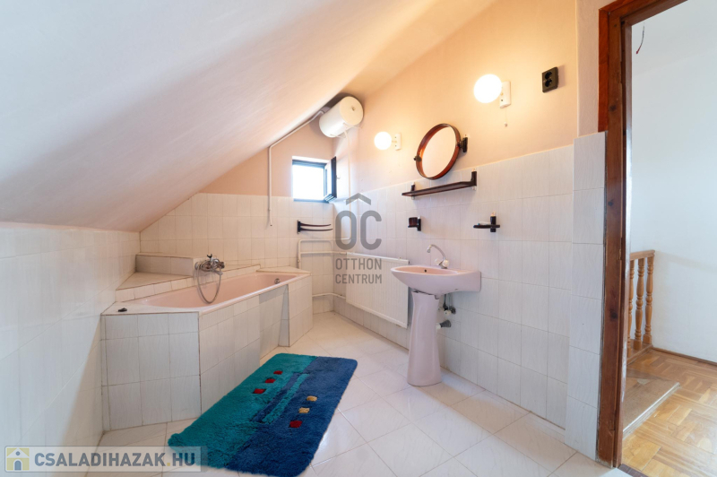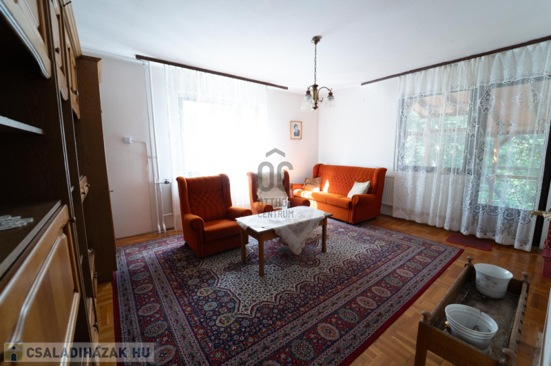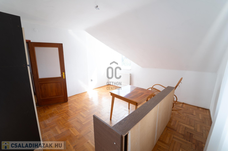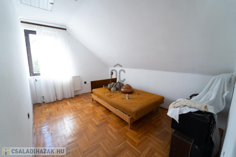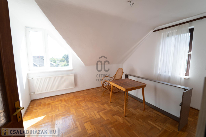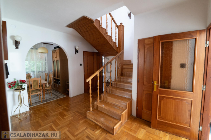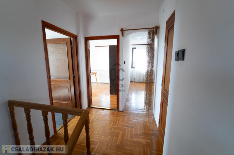 A 90-es évek elején épült, masszív szerkezetű családi ház két lakószinttel és teljesen alápincézett kialakítással rendelkezik. A pince szinten négy helyiség kapott helyet, köztük a garázs és a kazánház, ahol gáz- és vegyes tüzelésű kazán is biztosítja a fűtési lehetőségeket. Az alsó szinten a tágas előszoba után egy impozáns hall fogad, innen nyílik a 30 négyzetméteres nappali, az étkező és a konyha kamrával. Ugyanitt található egy hálószoba, egy fürdőszoba és egy külön wc is. A nappaliból egy 17 négyzetméteres fedett teraszra léphetsz ki, ahonnan a kert nyújt pihentető kilátást. Az emeletre széles falépcső vezet, ahol két nagyobb szoba került kialakításra, valamint egy kényelmes, világos fürdőszoba is szolgálja a család mindennapjait.