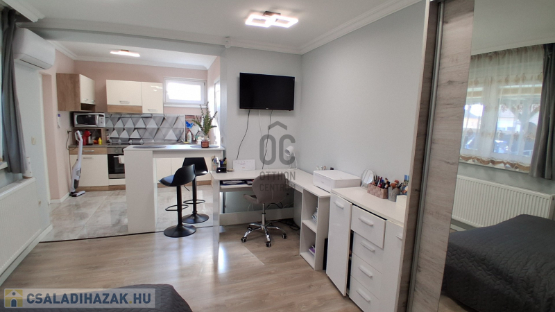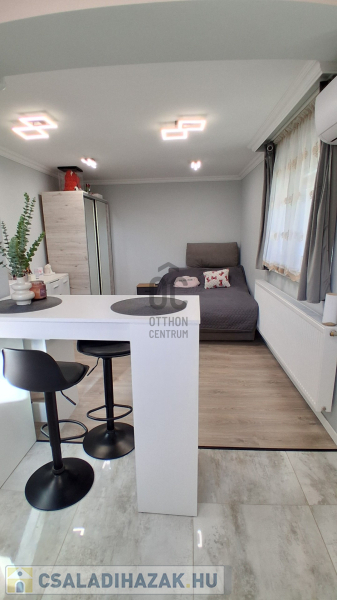 Külön bejáratú lakóegység: szoba–konyha egy légtérben, saját zuhanyzós WC-vel