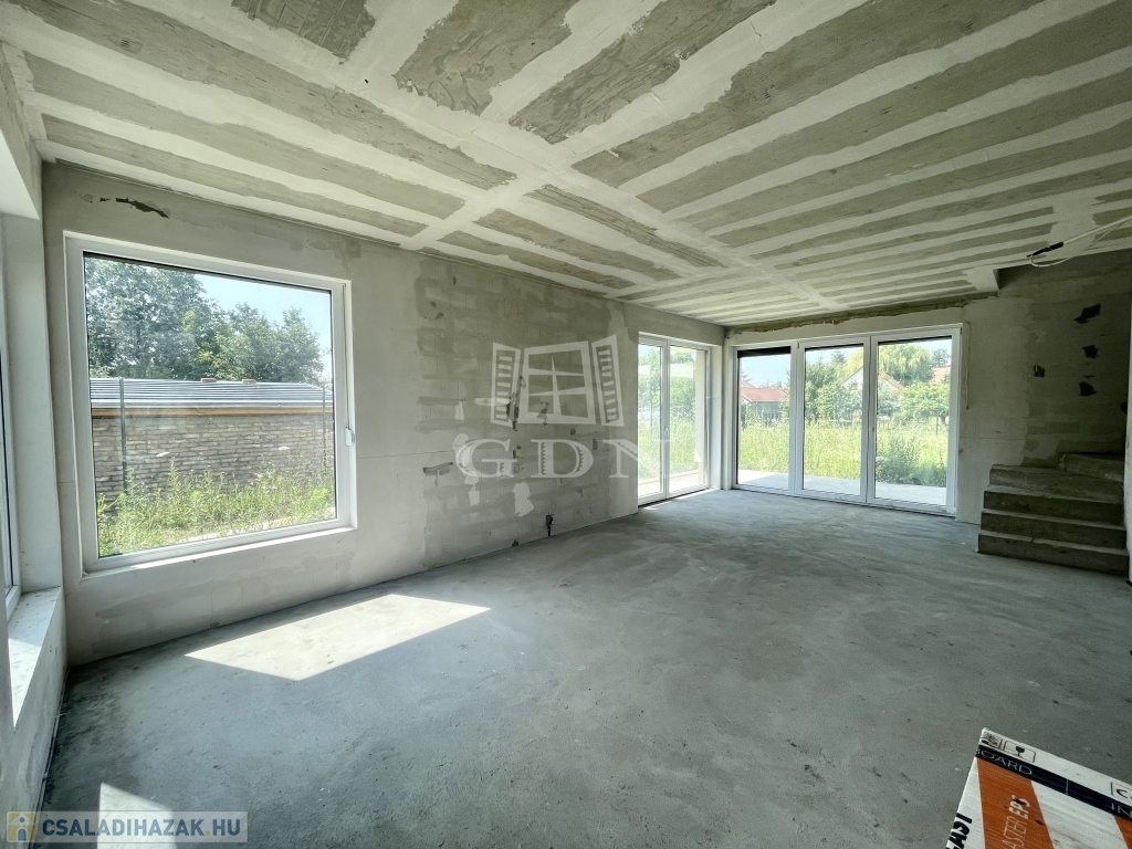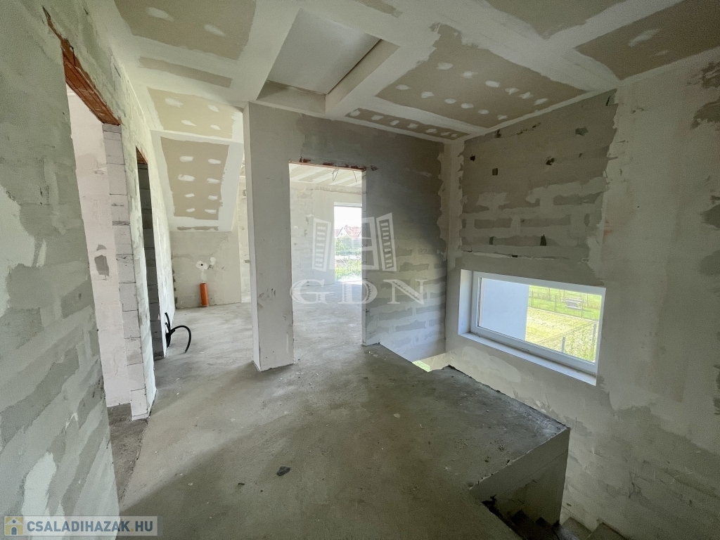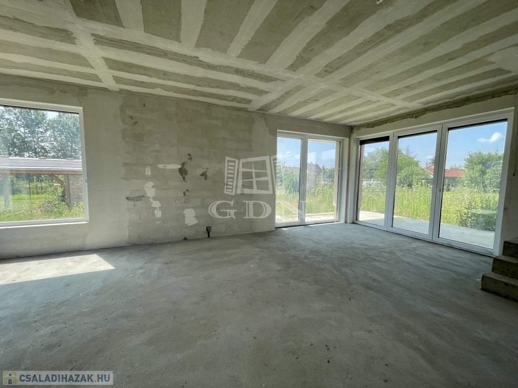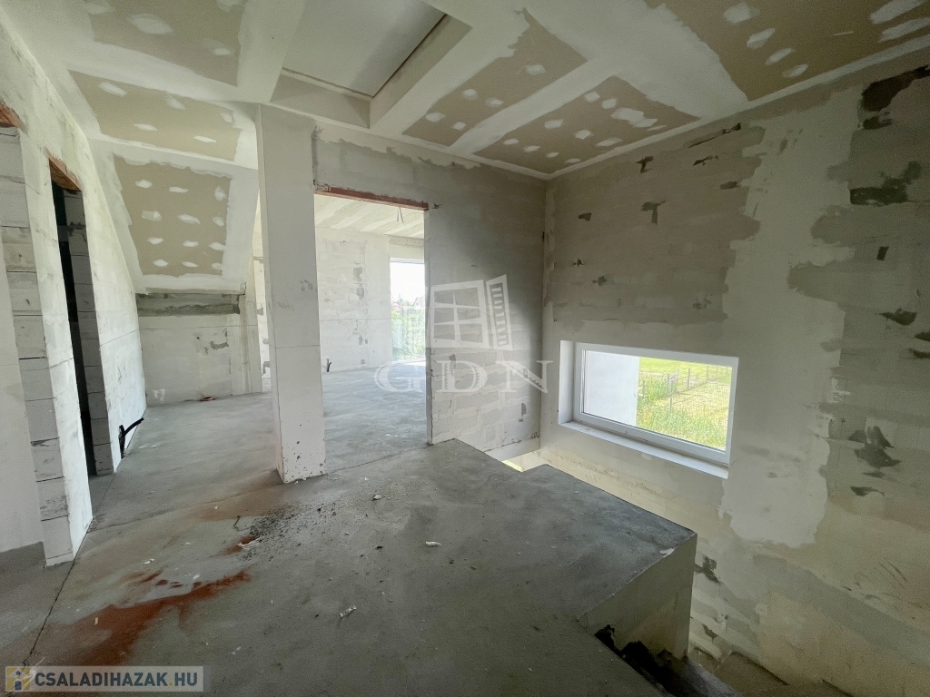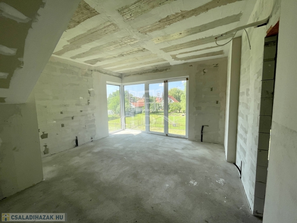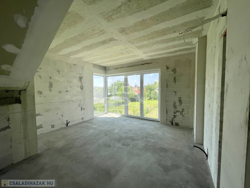 Tető alatt van, bent vannak a nyílászárók redőnnyel és szúnyoghálóval, A ház szigetelve és színezve van. A válaszfalak állnak, a fűtés és elektromos hálózat elő van készítve, be van csövezve.