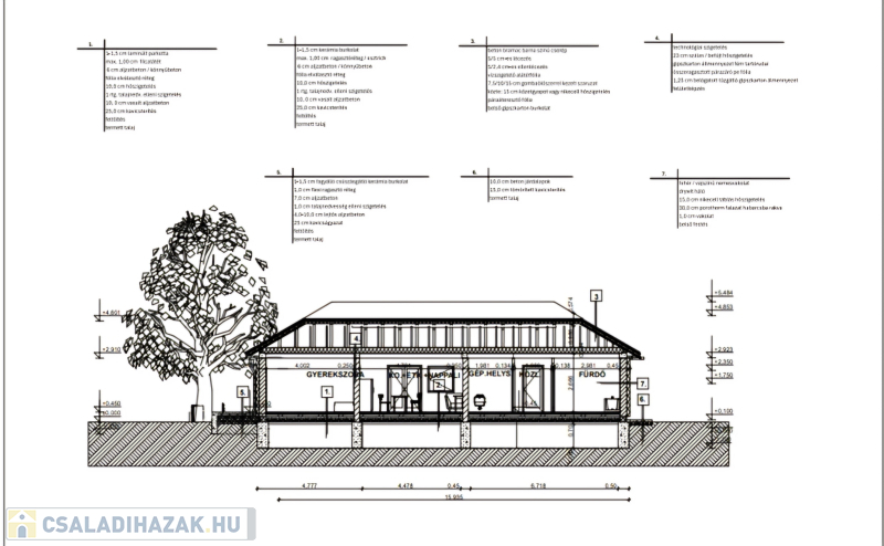 Szerkezeti leírás: Beton alap. Tégla főfalak + 15cm dryvit szigetelés. Tégla válaszfalak. A külső nyílászárók műanyag szerkezetűek. A belső nyílászárók dekorfóliás ajtók. A tető beton cseréppel fedett!