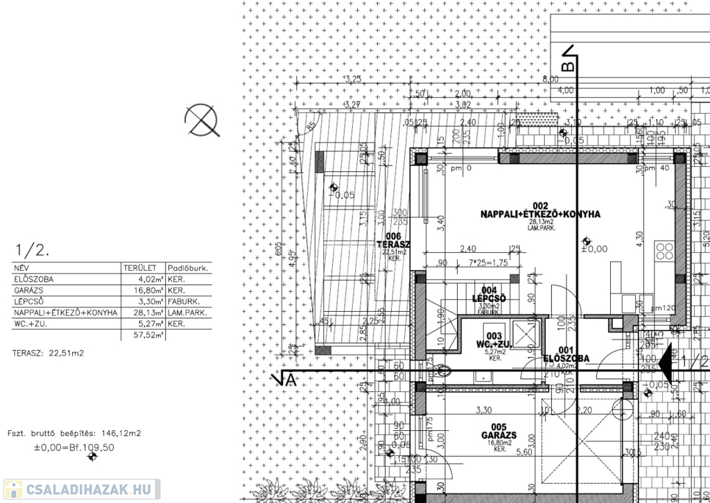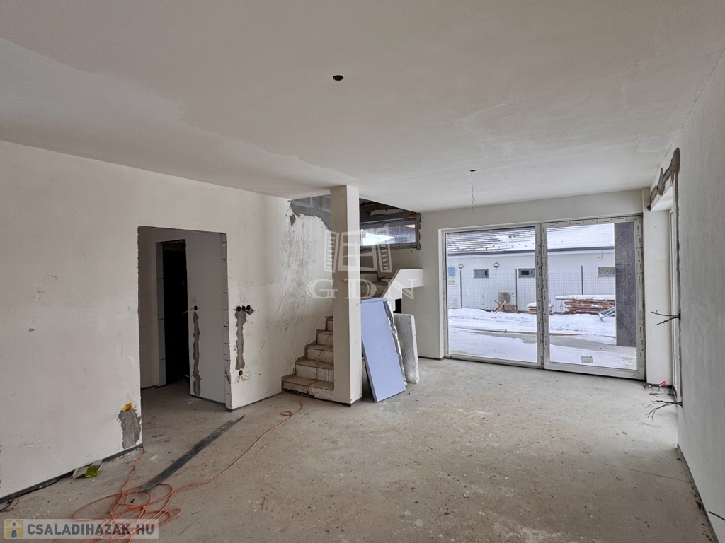 előszoba 4 m2, nappali-étkező+ konyha 28 m2, zuhanyozó +WC (5,27 m2), emeletre vezető lépcsőtér 3,3 m2, garázs 17,4 m2, plusz egy 22,5 m2-es terasz került kialakításra.