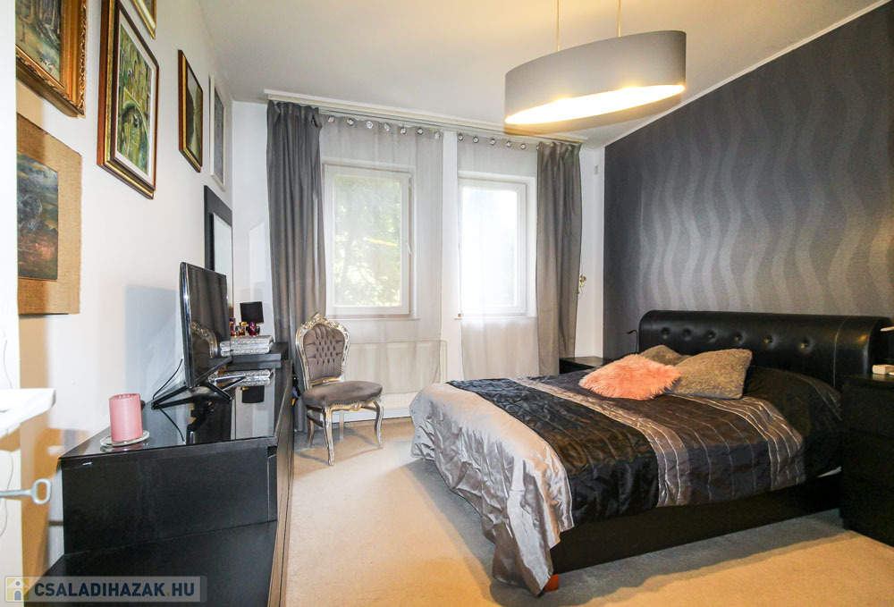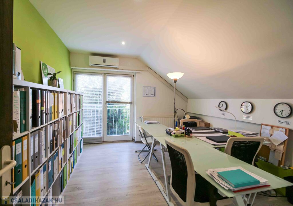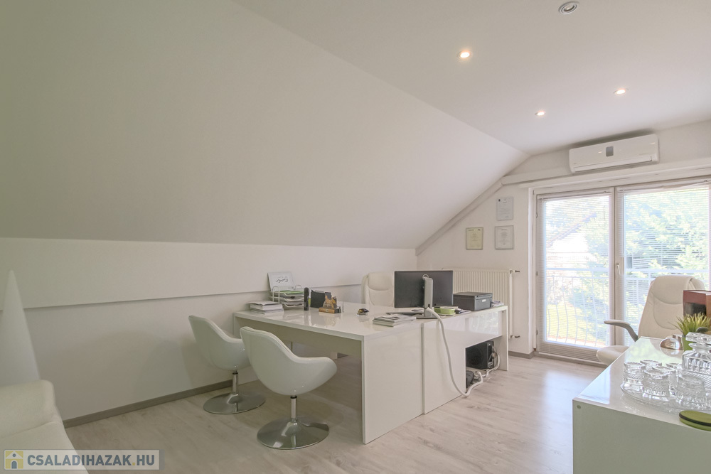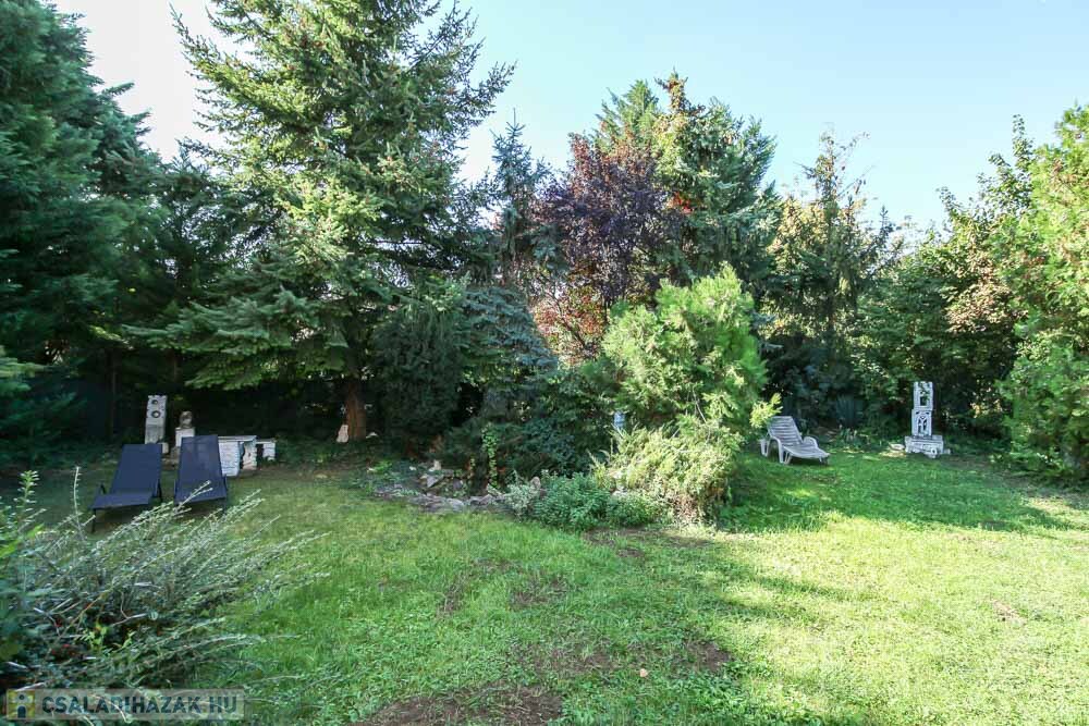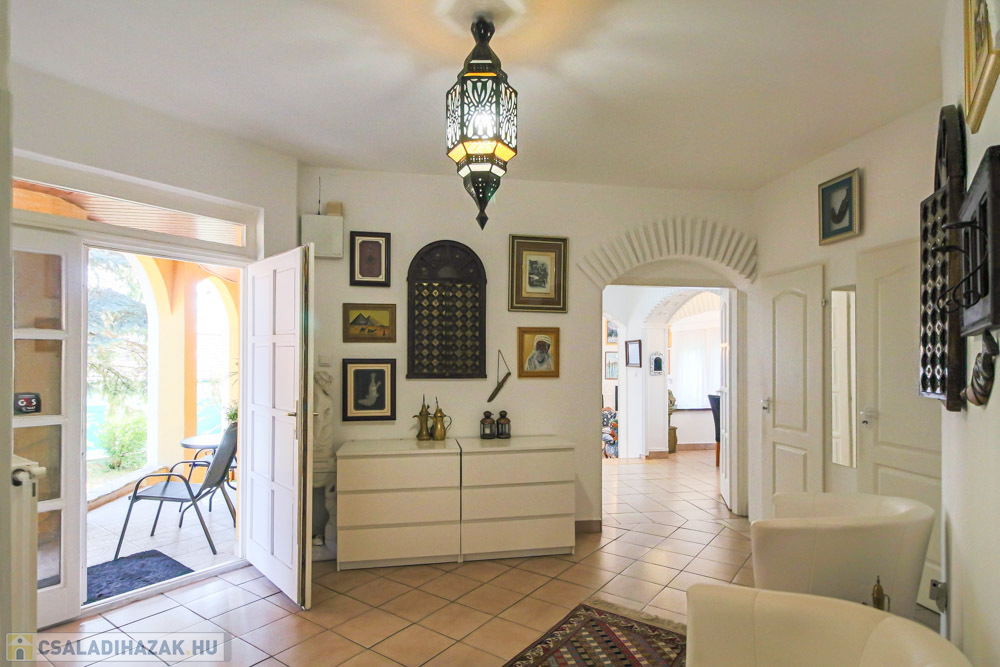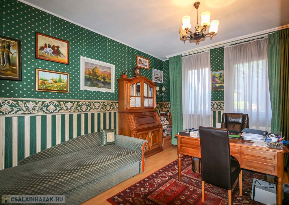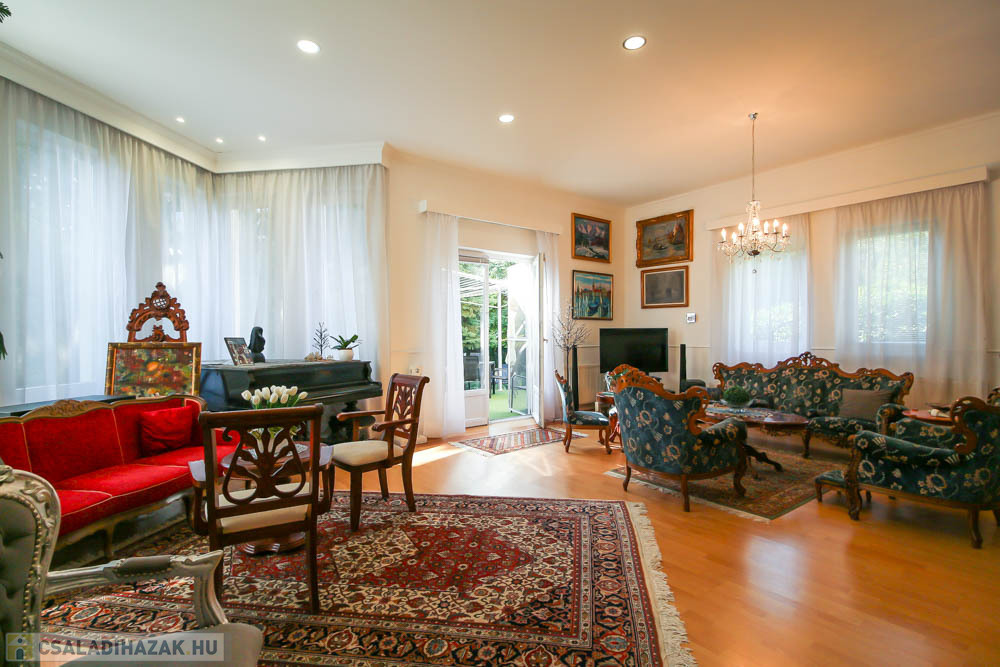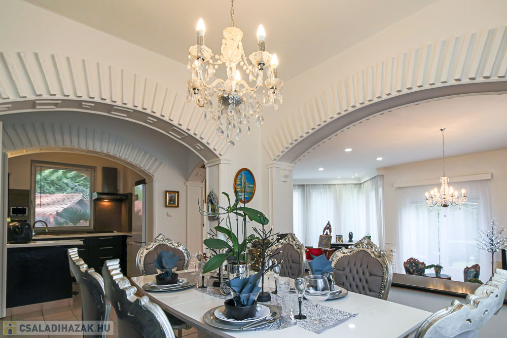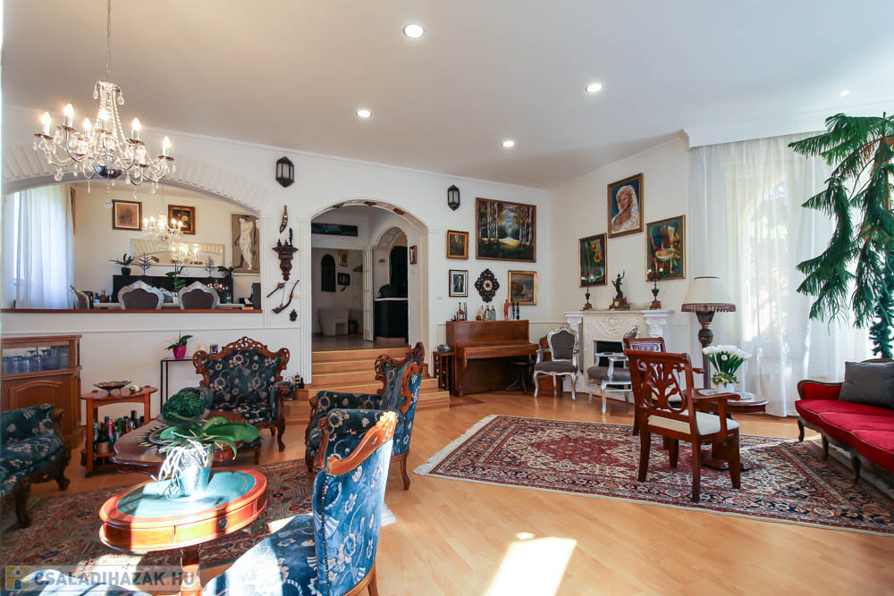 A szóba forgó klasszikus stílusban épült tornácos családi ház , a kíváncsi szemek elől elzárt ősfás park része, melyben az örökzöldeken kívül helyett kapott egy grillterasz, egy kerti tó és a garázson kívül udvari autóbeállók is. Az eladó ingatlan lakóterülete két szinten összesen 280 nm, mely jelenlegi elosztása szerint a hall-t, 2 fürdőszobát egyet szaunával, + 1 illemhelyet, 6 szobát egy nyitott nappalit takar. Utóbbihoz inkább a szalon megnevezést tartanám kifejezőnek, mivel e helység és a konyha, étkező együttese összesen 70 négyzetméterével a ház központi eleme, természetesen teraszkapcsolattal. Igazán impozáns a hatalmas ablakaival, boltíves díszítő elemeivel, kandallóval, bársarokkal, e helység belmagassága 3.4 m, ami csak emel a szinten.