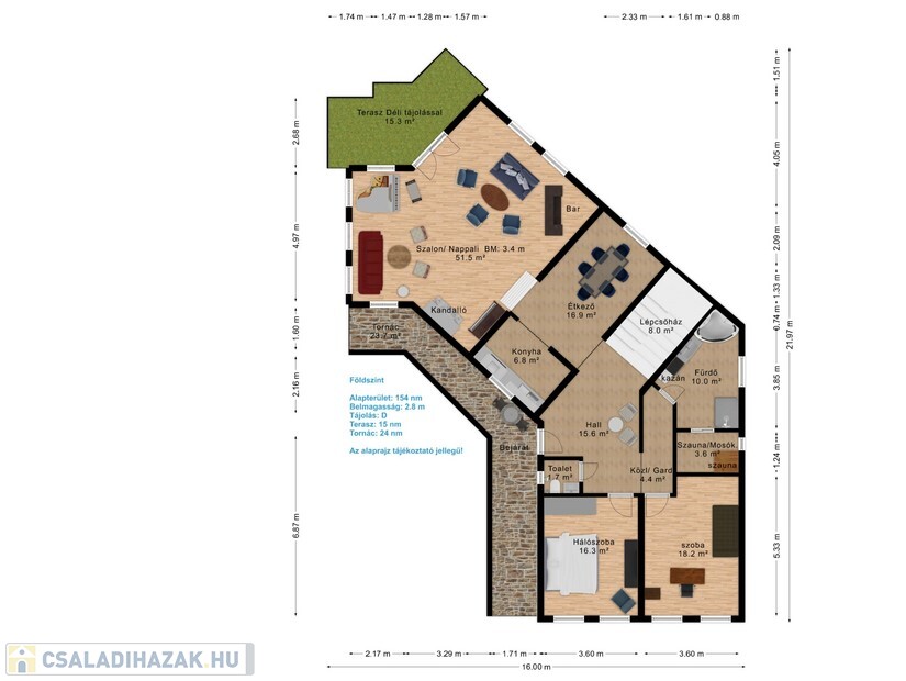 Terület számítások: 3 szinten összesen 350 nm terasz és tornác nélkül. Ebből a lakótér: 280 nm, alagsor: 70 nm, így a hasznos terület kb. 300 nm.