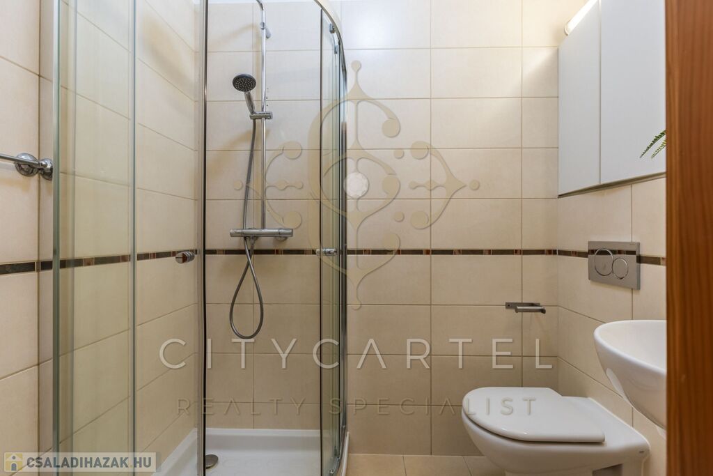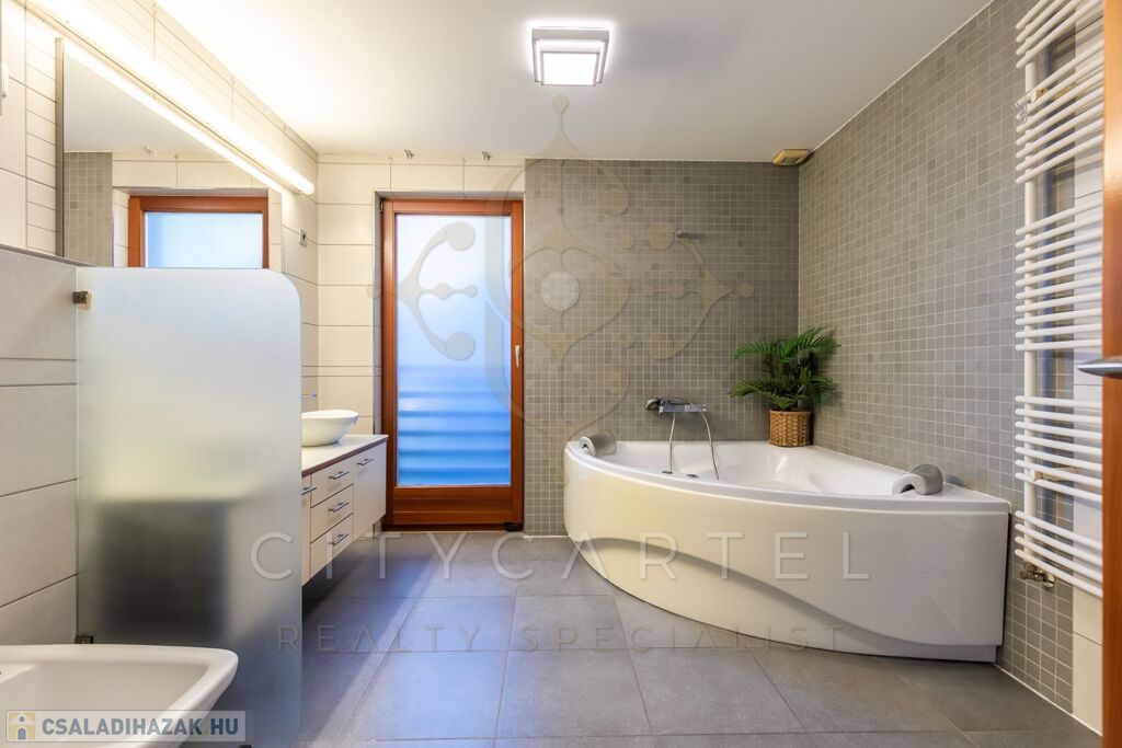 Fürdőszoba: Prémium burkolatokkal, sarokkáddal, zuhanyzóval, WC-vel és bidével felszerelve.