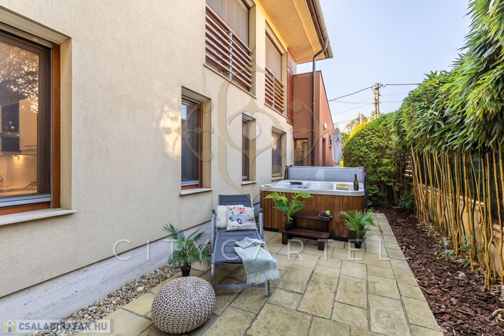 E ingatlanhoz 205/350 tulajdoni hányad tartozik. Ezen belül 305 nm privát, parkosított kert áll rendelkezésre, amely közvetlen kapcsolatot biztosít a két hatalmas teraszhoz és a saját wellness-részleghez