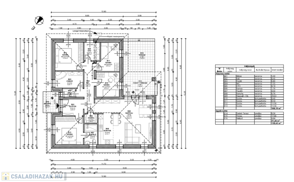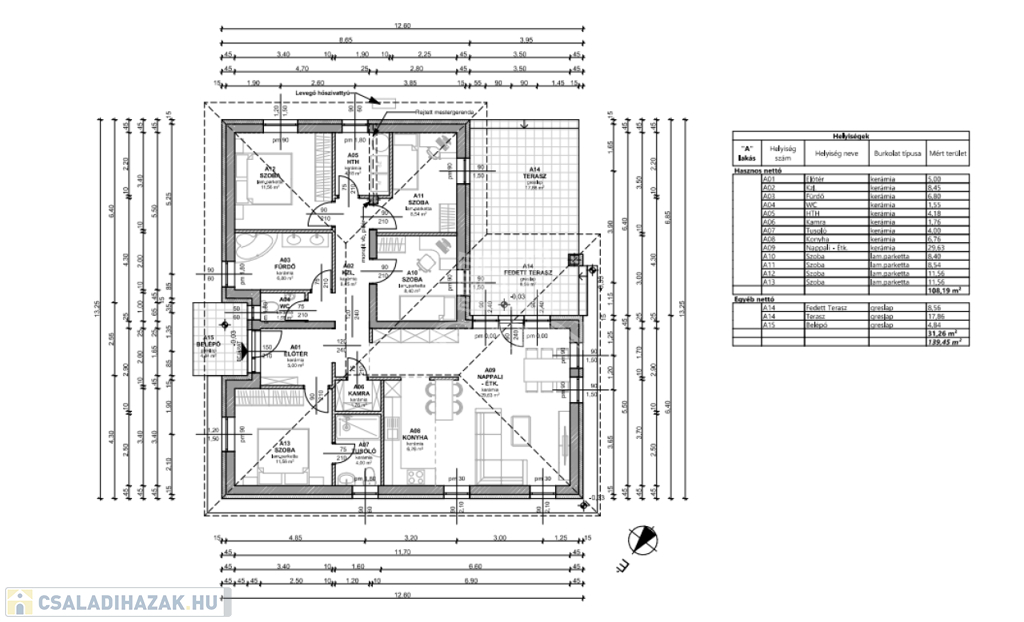 szoba 8,54 m2, szoba 11,56 m2, szoba 11,56 m2, terasz 26,42 m2.