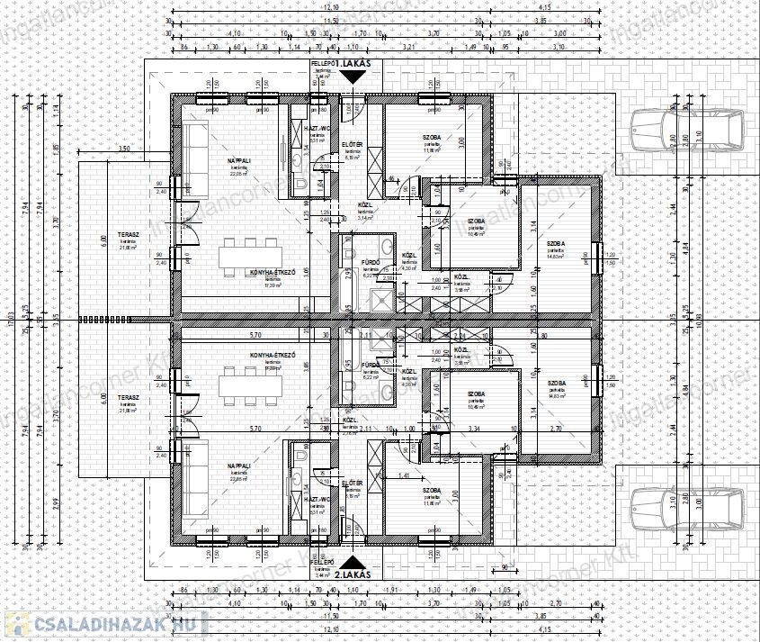 A terveken ház előtti gépkocsi beálló és gyalogos járda viacolor burkolattal kerülnek kiépítésre. Az lakások teraszai hideg burkolattal kerülnek kialakításra, egységes színben.