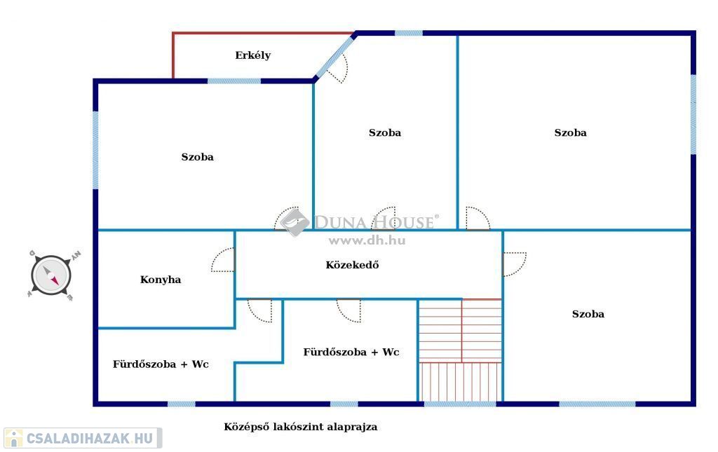 A középső szinten 4 különnyíló hálószoba, két fürdőszoba+wc, és egy konyha találhatóak. Az egyik fürdő és a konyha felújítása megkezdődött, azonban időközben félbe maradt, így e két helyiség befejezésre szorul.