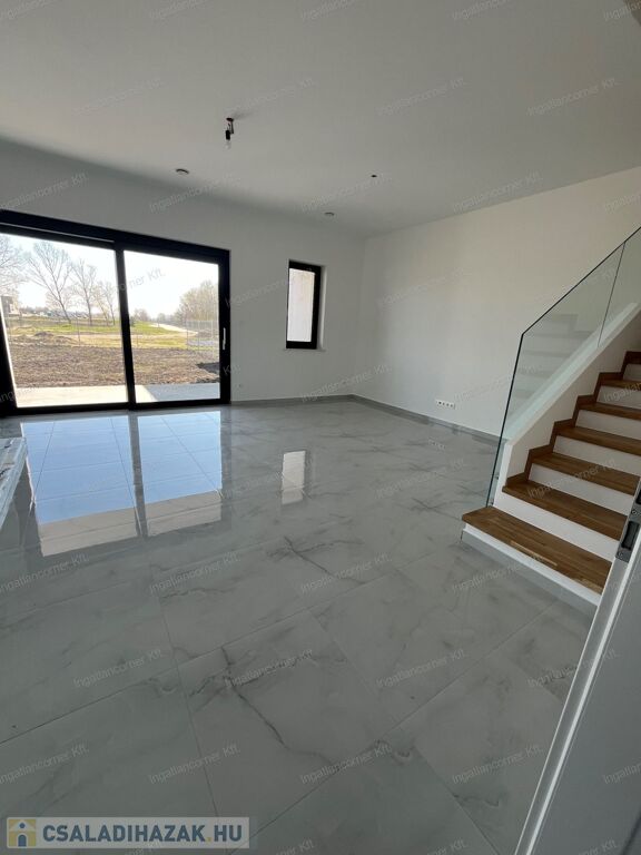 Az alsó szinten helyet kapott egy tágas amerikai konyhás-étkező, nappalival, valamint mellékhelyiség mosdóval.