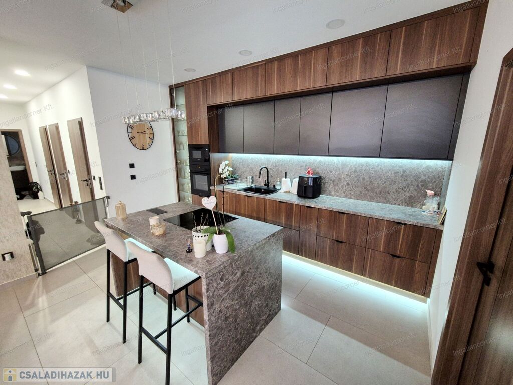 -MODERN KONYHA:A konyha maximális kihasználásával került kialakításra, mennyezetig érő, egyedileg beépített konyhabútorral. A LED-világítással ellátott alsó szekrény, vitrines szekrény praktikus és esztétikus helyet biztosít a kristálypoharak számára.