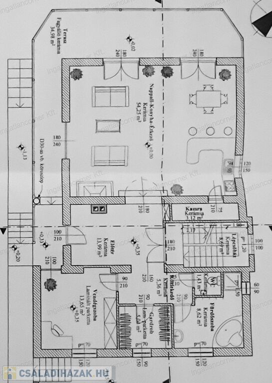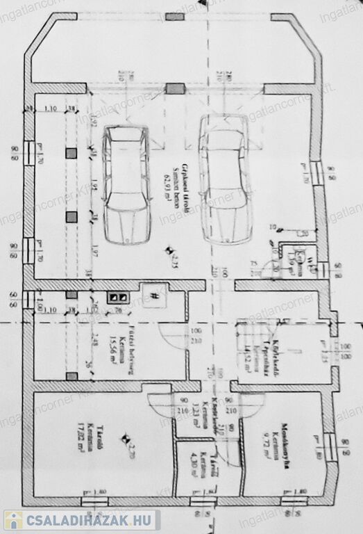 A 3 szintes épület alsó szintjén kapott helyett a dupla garázs, gépészeti helyiség, wc, mosókonyha, tárolók, mely szint szuterén így ablakokkal ellátott.