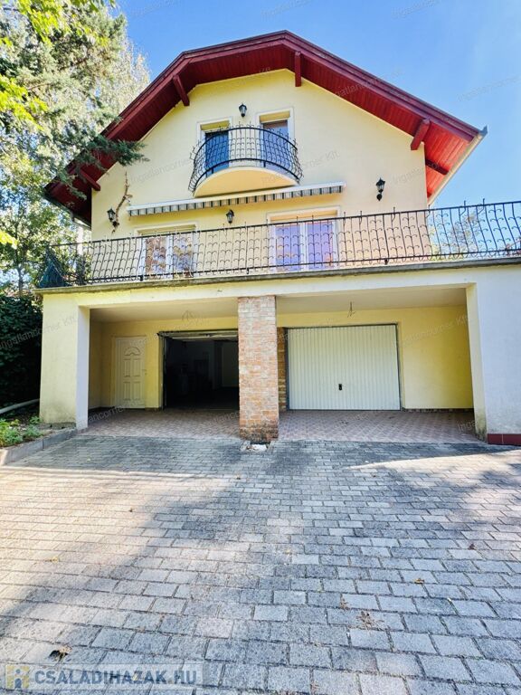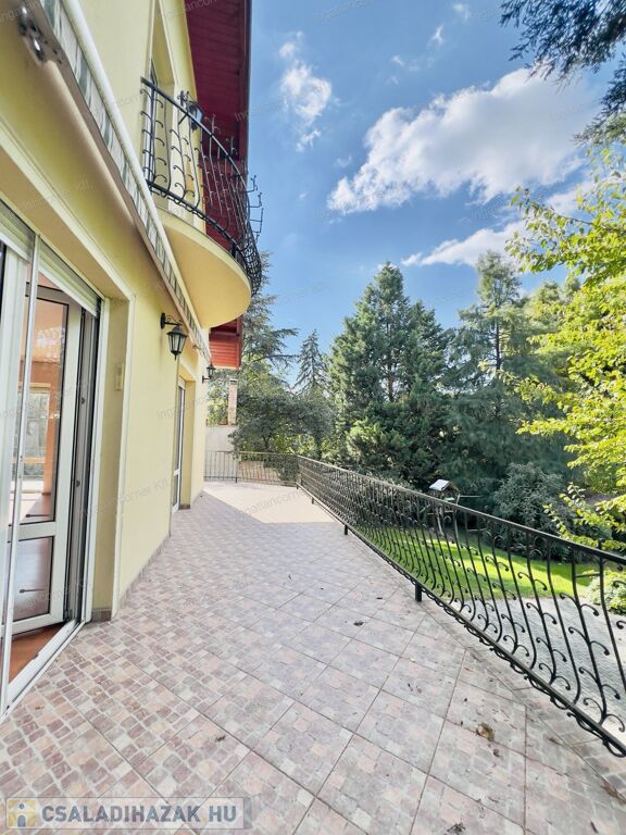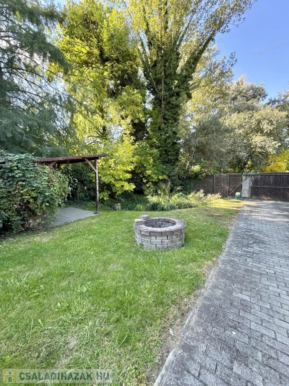 Enyhén lejtős, kettő utcára nyíló telek, gyönyörűen parkosított, ősfás, kerti tavas terület, kerti szaletlivel, gyerek játszóval.