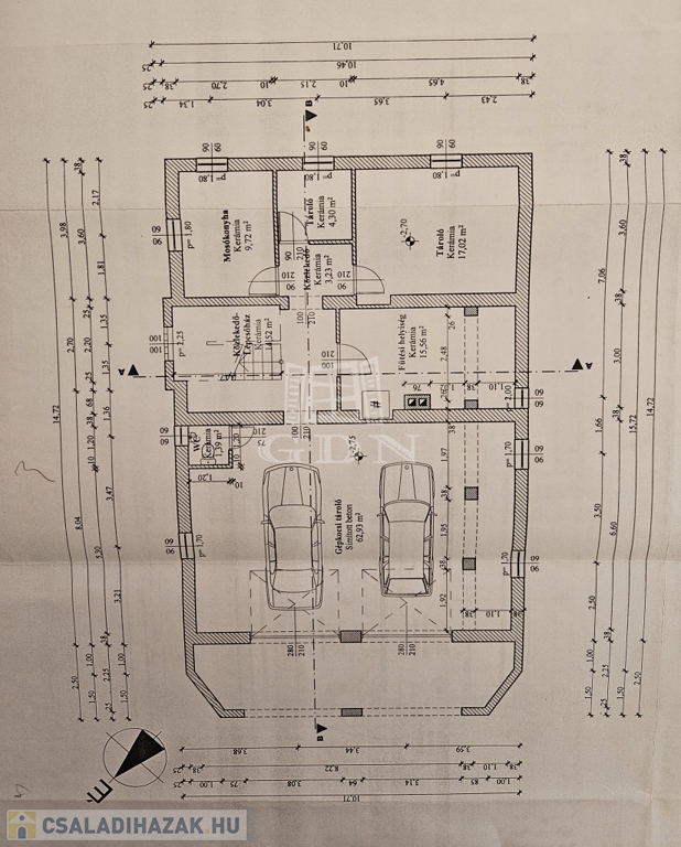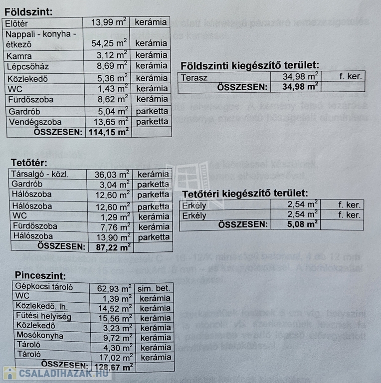 Az alsó szinten (128 m2), 3 autó számára alkalmas garázs, mosókonyha, 3 tároló, gépészeti helyiség található.