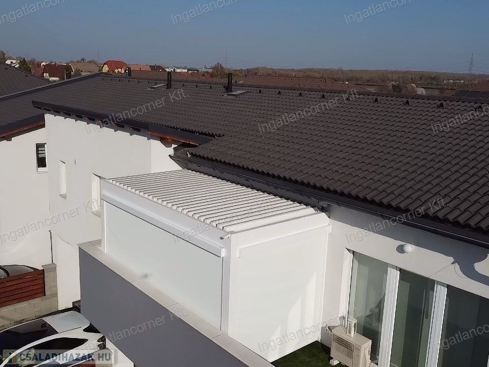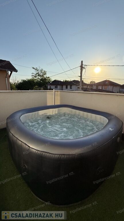 A hatalmas méretű teraszon a virágok és kerti bútor szett mellett kényelmesen elfér a jakuzzi is. A teraszon elektromos sötétítő rendszer lett kiépítve hangulatvilágítással (ennek ára 10 millió Ft újonnan).