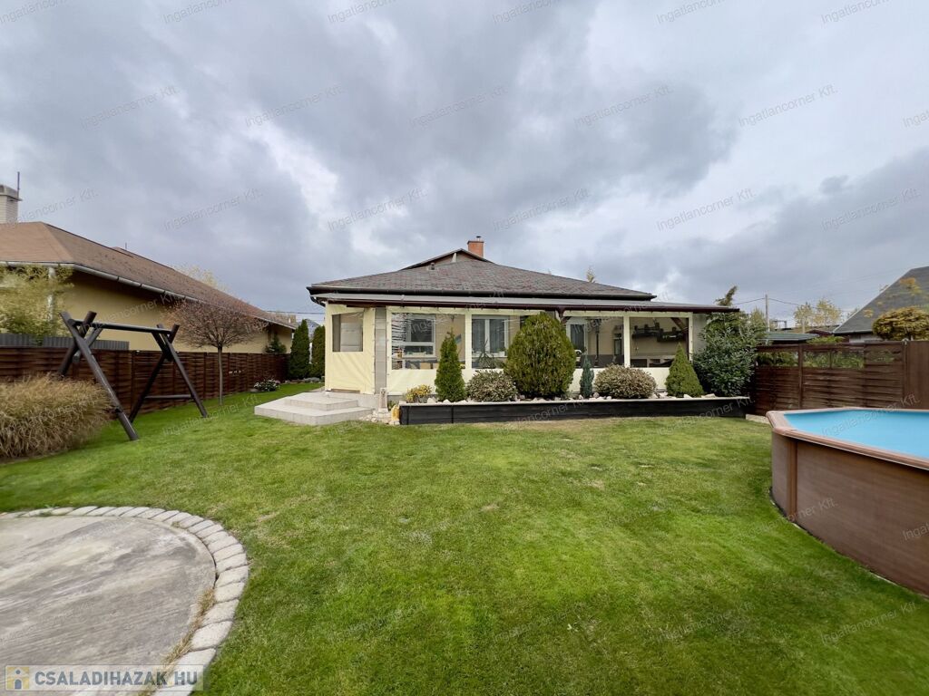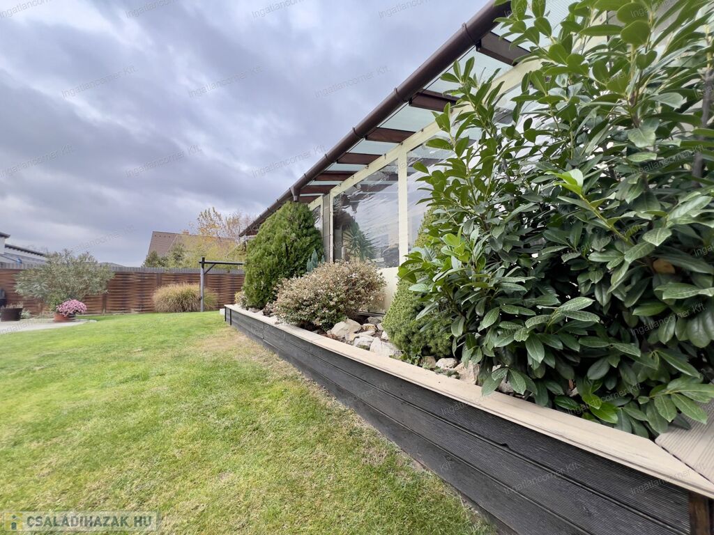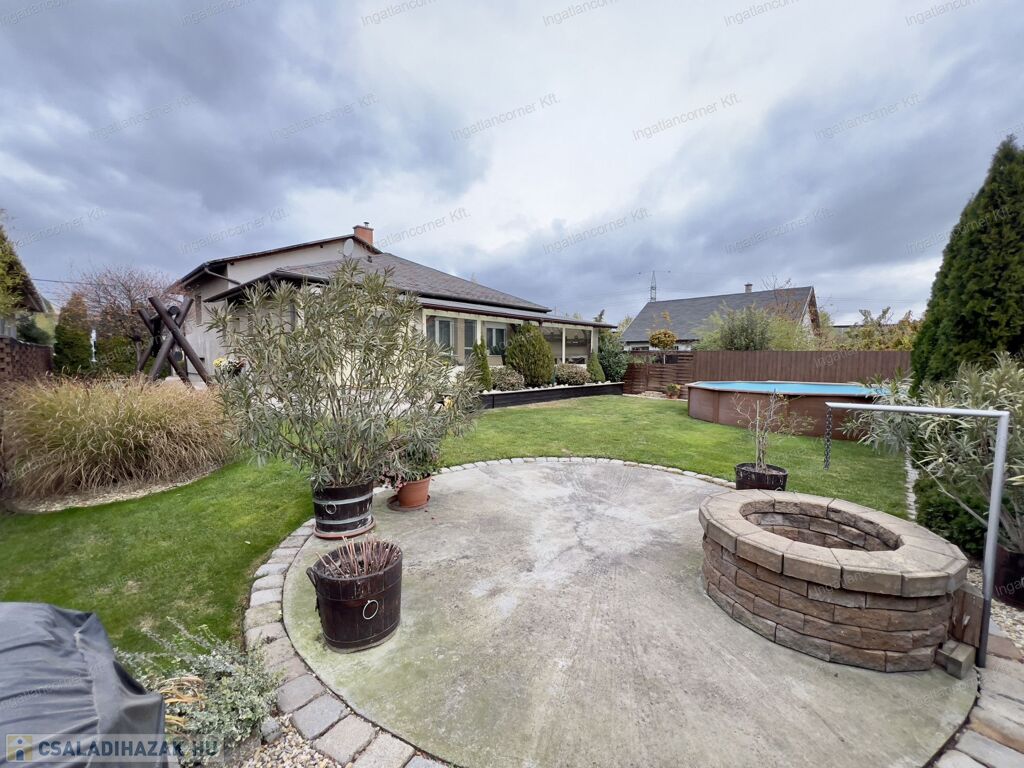 A kert szépen parkosított, örökzöld növényekkel ültetett, ahol helyett kapott a medence illetve a bográcsozó hely is, automata öntözőrendszer, fúrt kúttal.