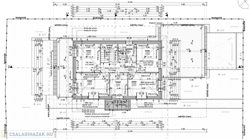 - főfal 15 cm EPS, aljzatban 12 cm, födémen 25 cm szigetelés