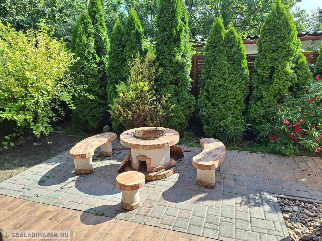 A kert szépen parkosított, hangulatos, gyönyörű örökzöld bokrokkal illetve fákkal.