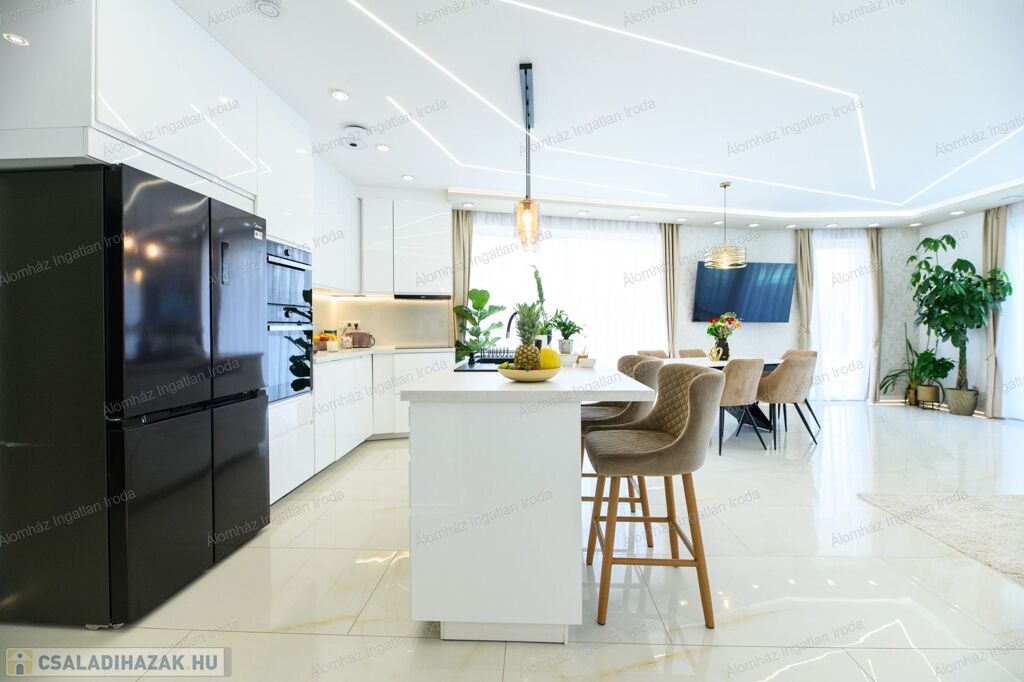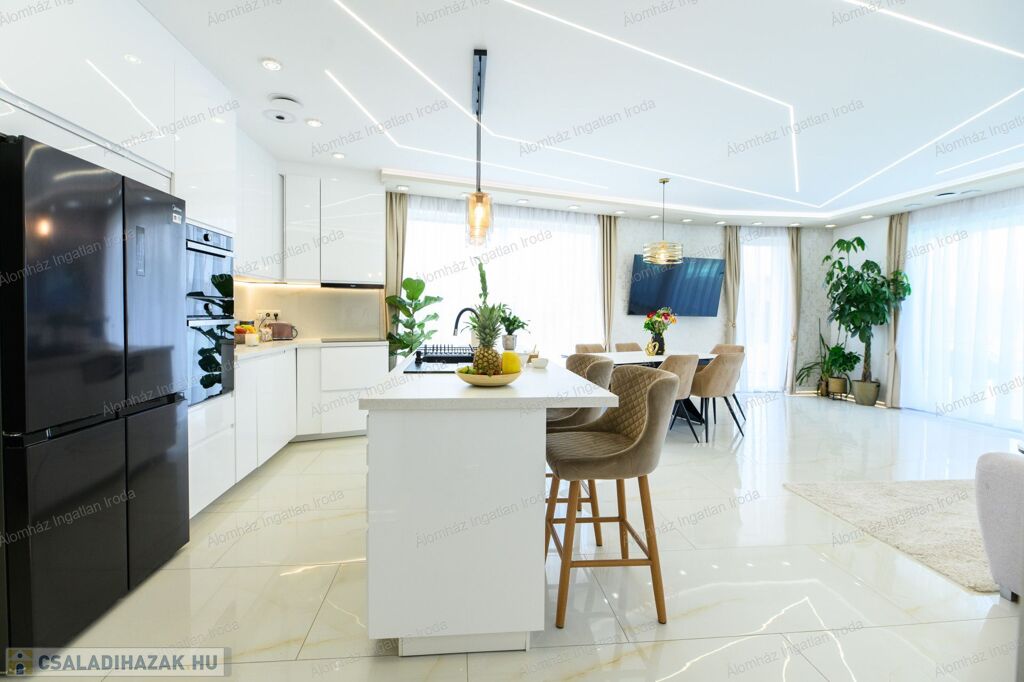 Eladó egy egyedülálló kialakítású, újszerű, 135 m²-es luxus családi ház Dunaharaszti egyik legkedveltebb részén, a Millenniumi lakóparkban, 1023 m²-es, parkosított telken.