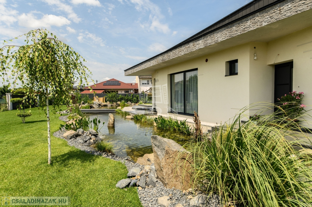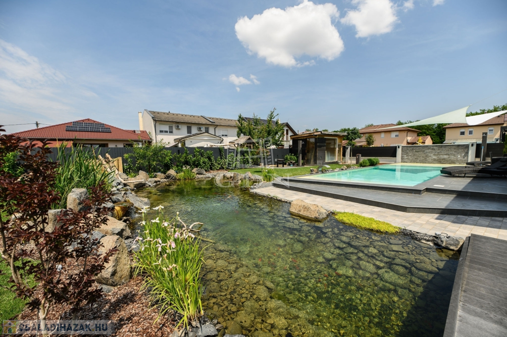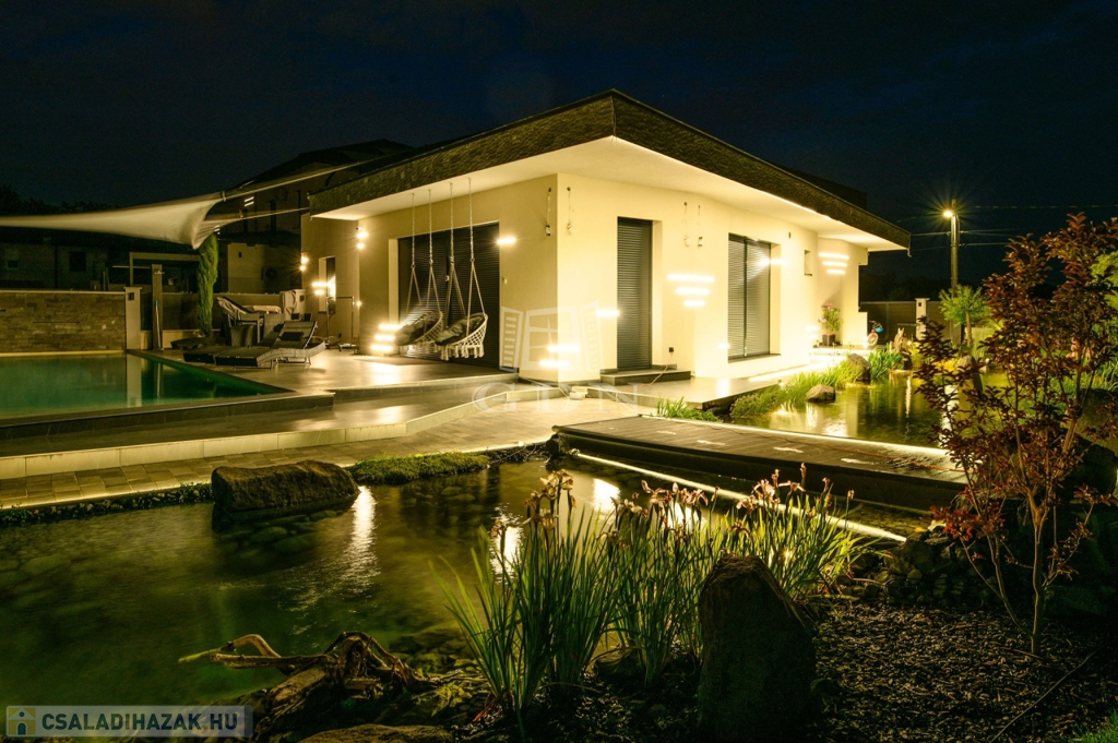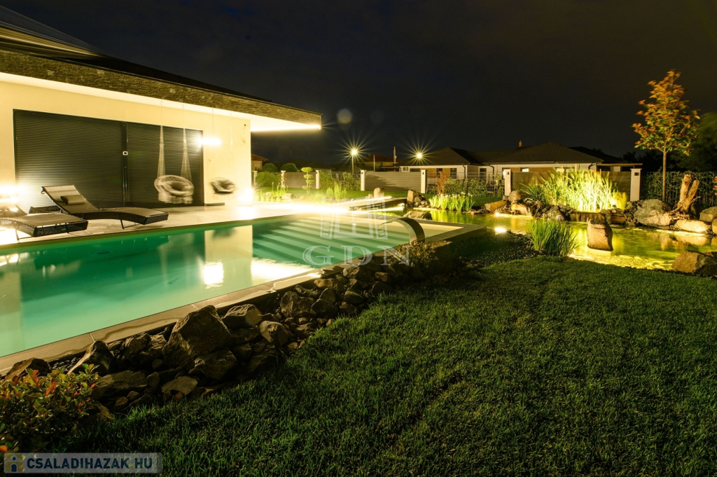 •A gondozott kertben egy 15x4 méteres, LEDVILÁGÍTÁSSAL, vízeséssel ellátott 60m2-es medence, valamint 30 méteres, öntisztuló kerti tó is helyet kapott.