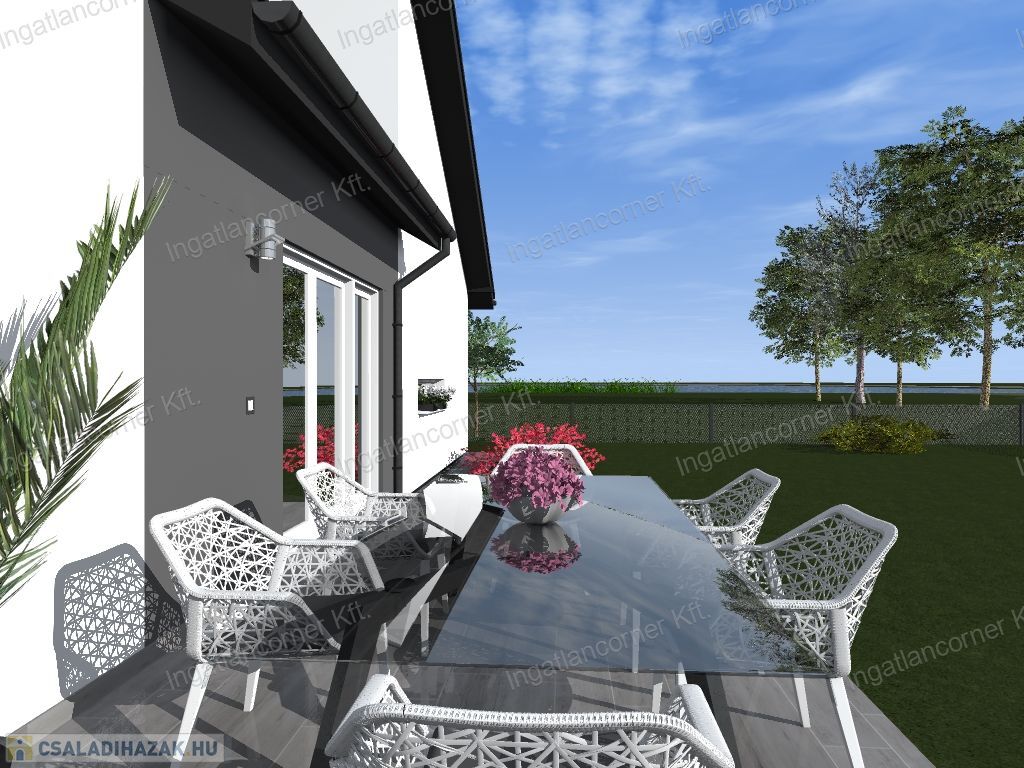 A terveken ház előtti gépkocsi beálló és gyalogos járda viacolor burkolattal kerülnek kiépítésre. Az lakások teraszai hideg burkolattal kerülnek kialakításra, egységes színben.