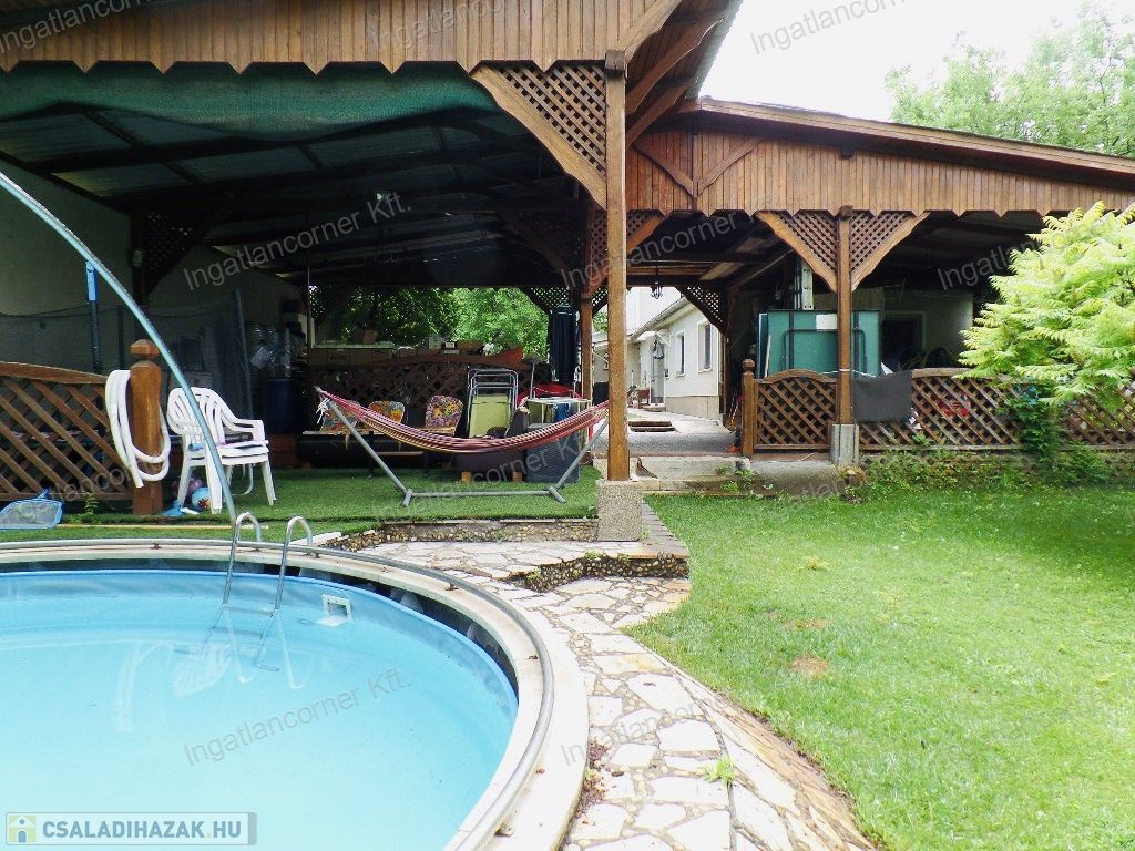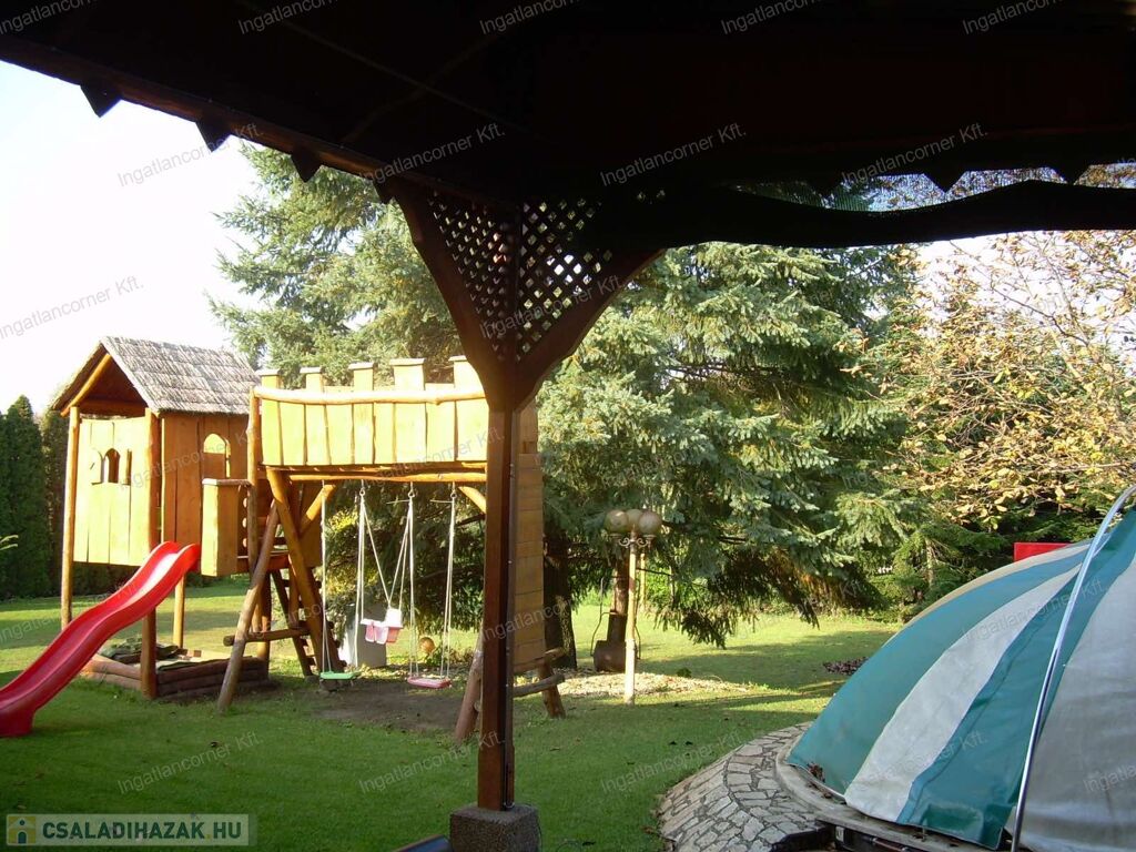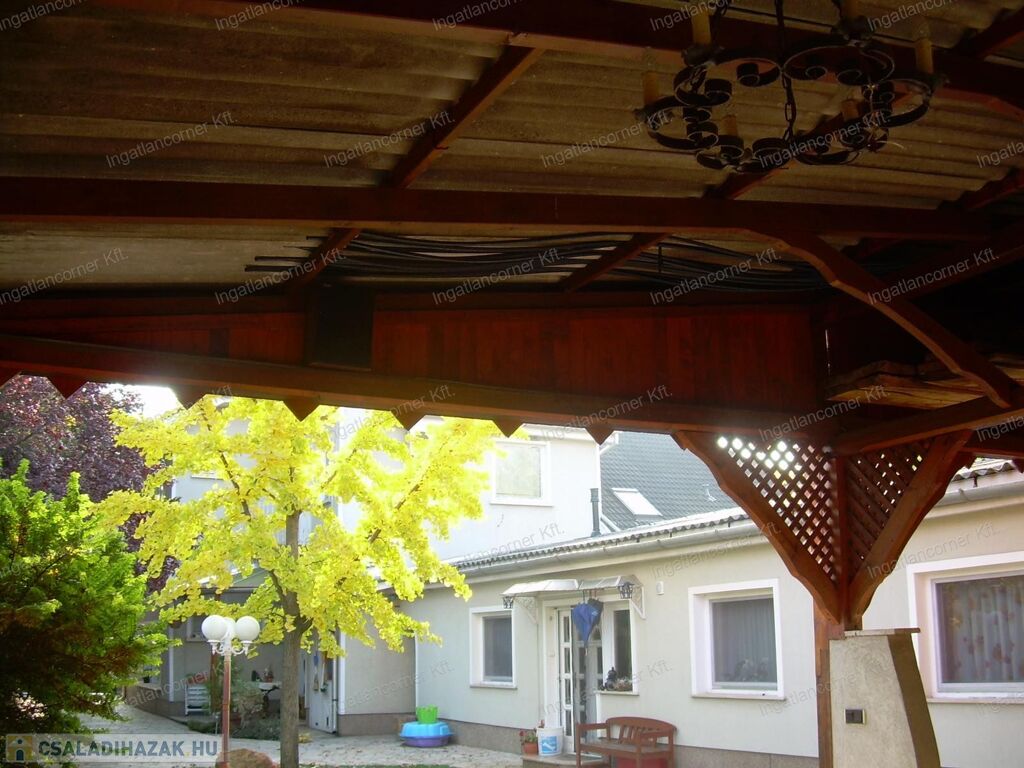 Az öntözőrendszerrel kiépített, parkosított és terméskővel burkolt udvaron található több autó parkolására alkalmas fedett és zárt garázs, tárolók, teraszok, játszótér, kültéri medence. Az 1. lakrész alatt található 15m2 boltíves pince.