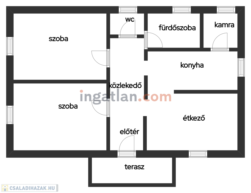 Elosztása:-előtér,közlekedő, 2 külön bejáratú nagy szoba, konyha, étkező, kamra, fürdőszoba, wc.