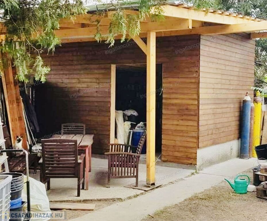 Térkövezett kocsi beálló, és kerti tároló is kapott helyet. Terasz, medence.