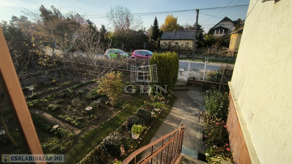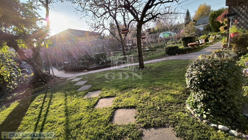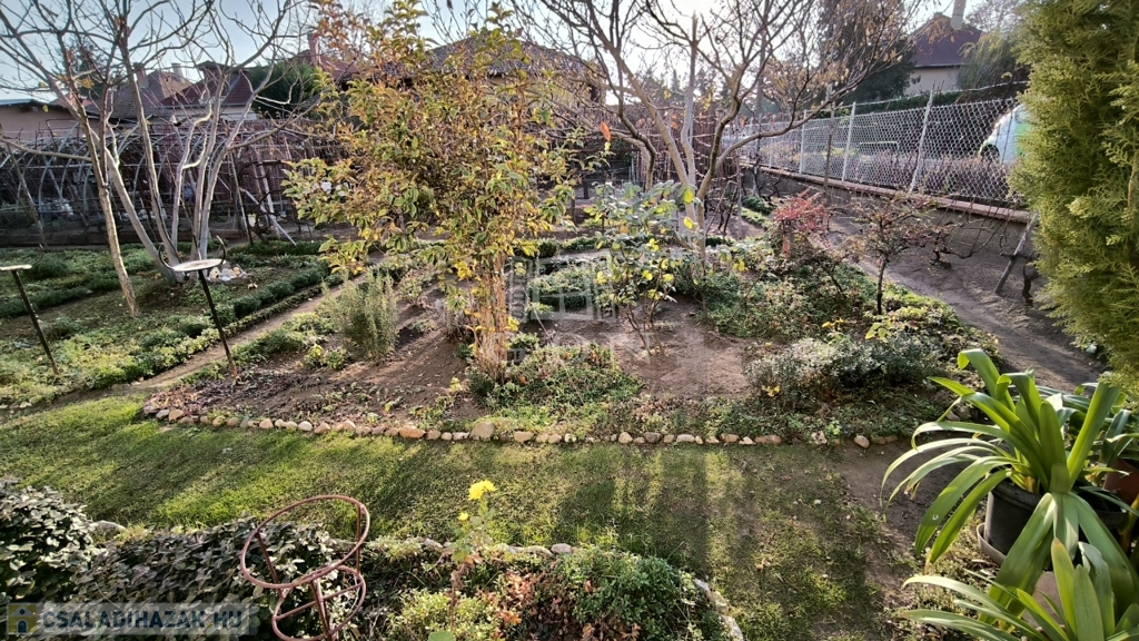 Két aszfaltos utcáról is bejuthatunk a telekre, az egyik ilyen beállóhoz garázs is tartozik. A kert gondosan karbantartott, állandóan napfényben fürdik.