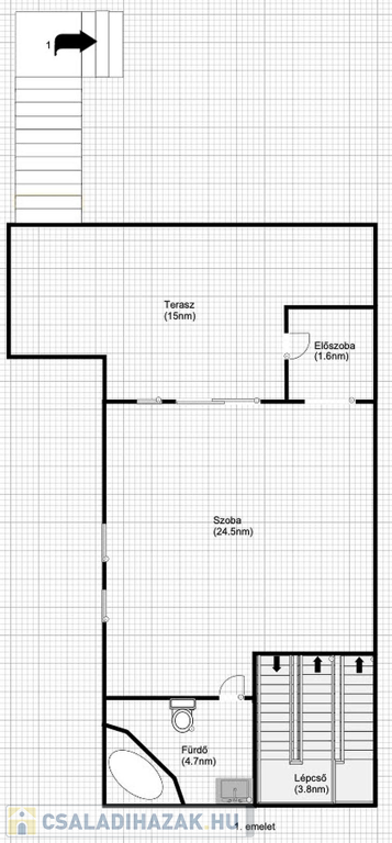 Az első emeleten egy előtér, egy szoba vagy nappali, egy sarokkádas fürdőszoba, valamint egy hatalmas, 15 nm-es terasz található, ahonnan szintén élvezhető a lenyűgöző dunai kilátás.