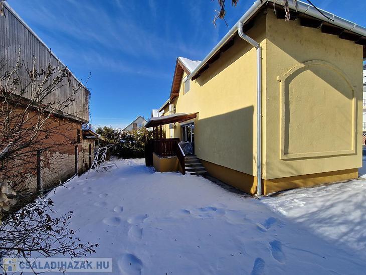 A házhoz emeleti erkély, hátsó terasz, beépített utcafronti terasz, valamint garázs tartozik. A ház előtt viacolorral burkolt parkoló van kialakítva, amely két autó számára kényelmes megoldást nyújt.