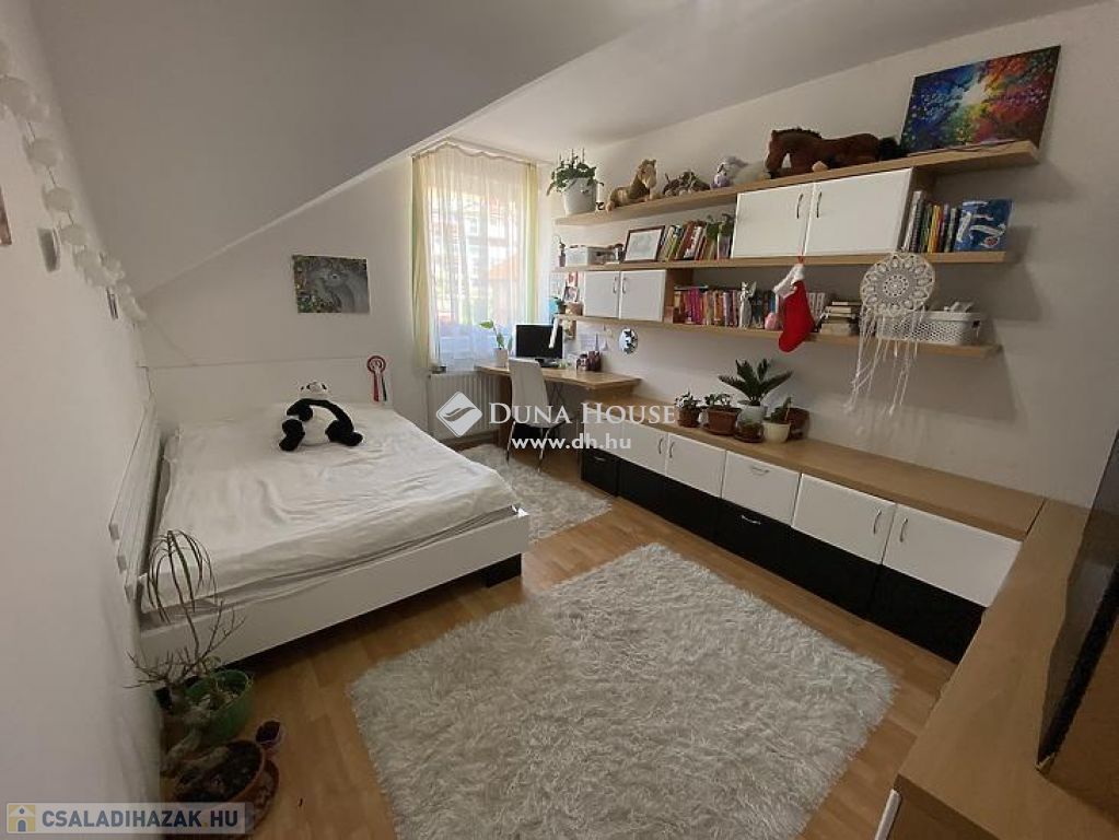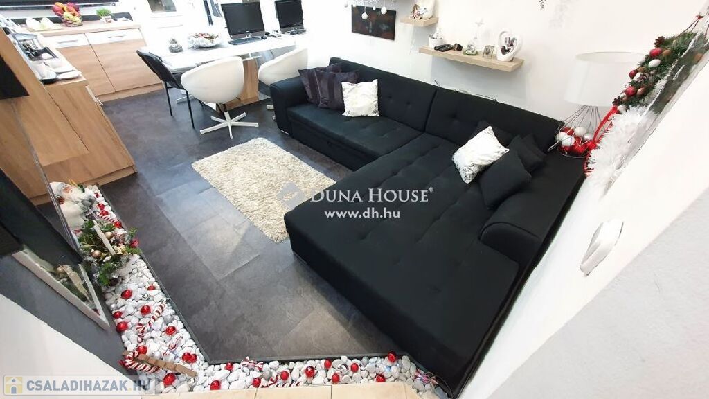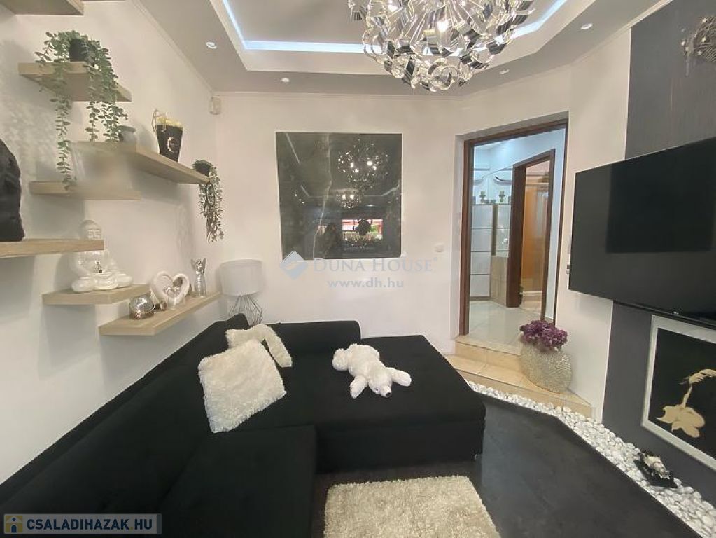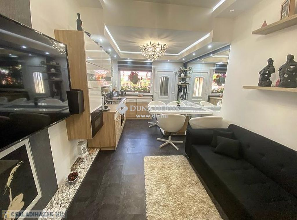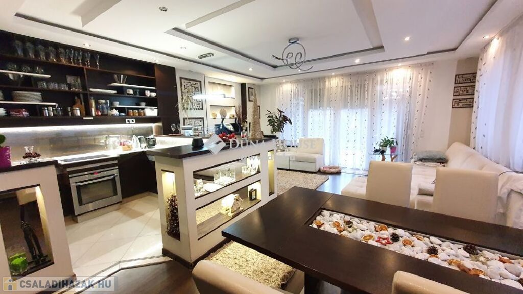 központhoz közel, mégis csendes, átmenő forgalomtól mentes utcában, 2 generációs kitűnő állapotú, modern, stílusos, sok extrával felszerelt ikerház fél eladó.A ház 380 m2-es telken áll, jelenleg 2 lakrészből áll, összesen bruttó 165 m2, 6 szobával és egy 17 m2-es fedett terasszal rendelkezik, dupla komfortos, szép világos, kellemes, otthonos, jó terekkel rendelkező, igény szerint akár tovább alakítható,A ház 2006-ban épült, 38-as Porotherm téglából, és 10 cm-es dryvit, szigetelést kapott.A ház téli teljes rezsiköltsége 46 000 Ft.A 2 szint között betonfödémmel ellátott, a tető Bramac cseréppel fedett.A fűtés és a meleg víz ellátás cirkó berendezéssel megoldottA ház hő és hangszigetelt nyílászárókkal, redőnyökkel és szúnyoghálóval felszerelt.A burkolatok mindenhol jó minőségűek, és szép állapotban vannak.Az ingatlan 2 generációs jelen pillanatban, de könnyen visszaalakítható, egybe nyitható ahogy korábban volt, ebben az esetben van lehetőség egy fűtött garázs visszaállítására is, de tovább is bővíthető a ház akár 3 teljesen szeparált külön lakrészre is.A ház riasztó és klíma berendezéssel felszerelt.1 lakrészben jelenleg:-amerikai konyhás nappali- egy hálószoba,- fürdőszoba +WC,- kamra- külön leválasztott kertrész van2. lakrészben, ami belső 2 szintes jelenleg:-amerikai konyhás nappali, innen nyílik a terasz, és kert kapcsolat-3 hálószoba az emeleten,- fürdőszoba,- külön WC,- kamra,padlástér is innen érhető el ahol még 30 m2 szabadon alakítható, akár bővíthetőA kert parkosított, öntözőrendszerrel ellátott.A kertben van egy medence, egy kerti tó, és egy fúrt kút is.Jelenleg 2 db autóbeállási lehetőség van, amelyből egy fedett és egy fedetlen beállásra van hely.TV és internet szolgáltatást jelenleg a T-Home biztosítja.Extrák:- földszinten kisebb lakrészben a nappaliban padlófűtés.- 2 tároló az udvarban (12 nm-es, 6 nm-es)- Klíma- Elektromos kandalló- Fúrt kút- Kerti tó- Medence- RiasztóA vételár részét képezi a konyhabútor, a klíma berendezés, az elektromos kandalló, riasztó berendezés, igény szerint egyéb berendezések megállapodás tárgyát képezik.A környék nagyon jól ellátott, bevásárlás, iskola, óvoda, bölcsőde, központ, közlekedés, Duna part, percek alatt elérhetőek.