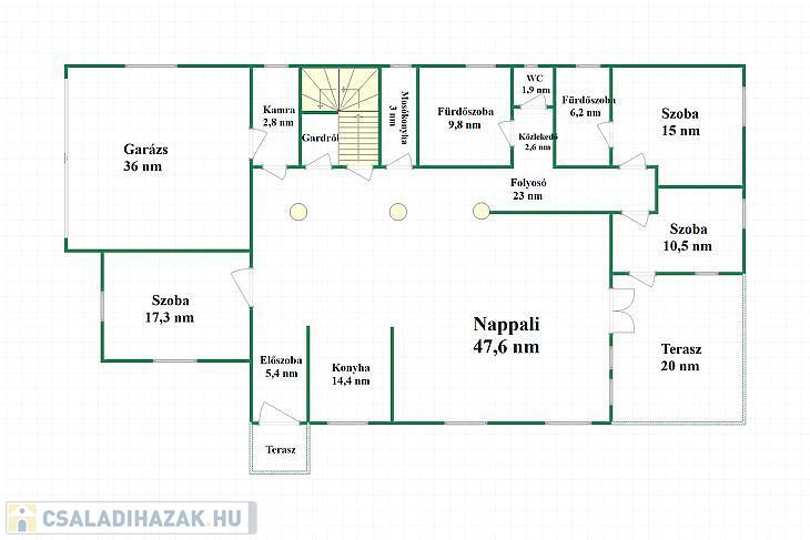 A teljes alapterület – beleértve a garázst, pincét és teraszt – 345 nm.